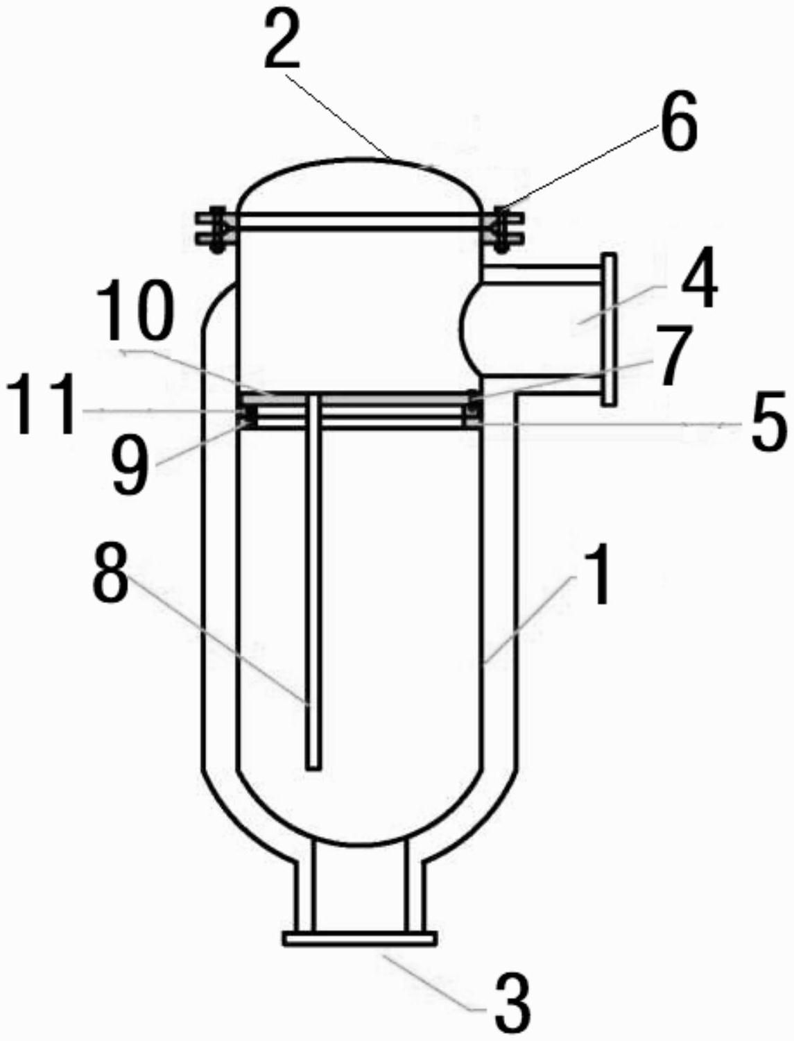 本实用新型提供一种应用于物料过滤设备技术领域的高压过滤器结构,所述的高压过滤器结构包括过滤器罐体(1),过滤器罐体(1)下部设置入口部(3),过滤器罐体(1)靠近上部侧面设置出口部(4),过滤器罐体(12)内壁设置固定圆盘(10),固定圆盘(10)下表面设置向入口部(3)方向延伸的滤棒(8),固定圆盘(10)下方设置支环(5),支环(5)外圈和过滤器罐体(1)内壁之间设置环形密封圈(11),本实用新型所述的高压过滤器结构,通过密封圈的布置替换垫片,确保密封精度,同时避免频繁更换垫片,提高使用便利性。