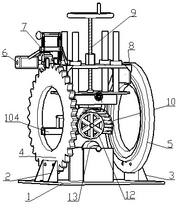 一种用于热转印机的手动调节装置,由底盘、支架Ⅰ、支架Ⅱ、齿轮盘、固定盘、转动轮、制动器、导向轮、位移调节装置、加热罩、转印电机、转印轮、支撑轮、放卷支架、收卷电机组成。支架Ⅰ和支架Ⅱ垂直固定在底盘上,齿轮盘固定在支架Ⅰ上,固定盘固定在支架Ⅱ上,转动轮、制动器和导向轮固定在位移调节装置上,位移调节装置与齿轮盘和固定盘相连,加热罩固定在位移调节装置上,转印电机安装在加热罩的侧板上,转印轮安装在转印电机的传动轴上,支撑轮安装在底盘上。