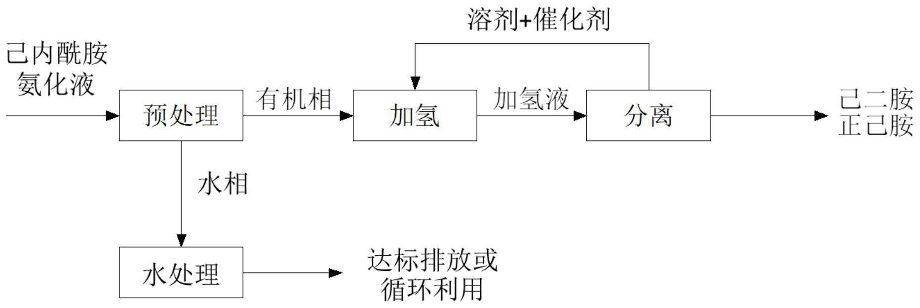 本发明提供一种己二胺关键中间体反应废水资源化利用的方法,所述方法包括如下步骤:(1)己内酰胺氨化液脱水物料经预处理,得到有机相和水相;(2)混合溶剂与步骤(1)所述有机相,在催化剂下进行加氢反应,得到加氢液;(3)步骤(2)所述加氢液经液液分离,得到正己胺和己二胺;所述方法能够回收己内酰胺氨化液脱水物料中有用物质并实现资源化,经加氢得到己二胺和副产正己胺,可直接作为产品,经济效益高。