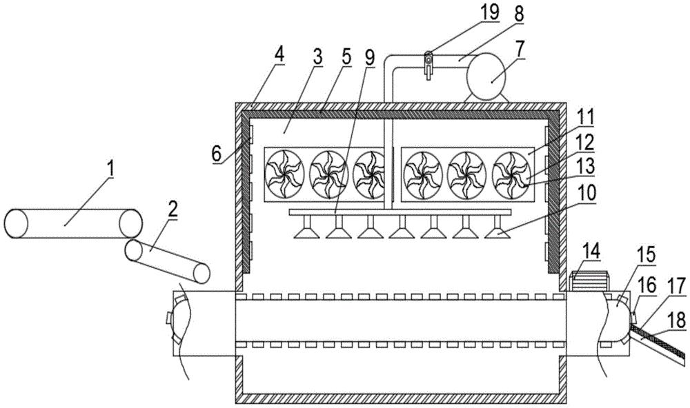 本实用新型涉及一种水产品快速冻结装置,特别涉及于水产品加工设备领域。本实用新型包括第一输送带、第二输送带、速冻仓、保温壳体、制冷管、无菌水箱、连接管道、分流管道、雾化喷头、冷风装置、传动电机、输送网带、滑槽;速冻仓的最外层由保温壳体组成,保温壳体内侧设有制冷管,制冷管上设有通孔,速冻仓的内侧设有冷风装置,冷风装置包括轴流风机,轴流风机内部设有扇叶。本实用新型对现有技术中水产品的运输提供了便利,在水产品捕捞后将其冻结运输,通过雾化喷头对水产品表面喷水后通过制冷管的制冷和冷风装置的风力让水产品迅速冻结,便于水产品后期运输。
