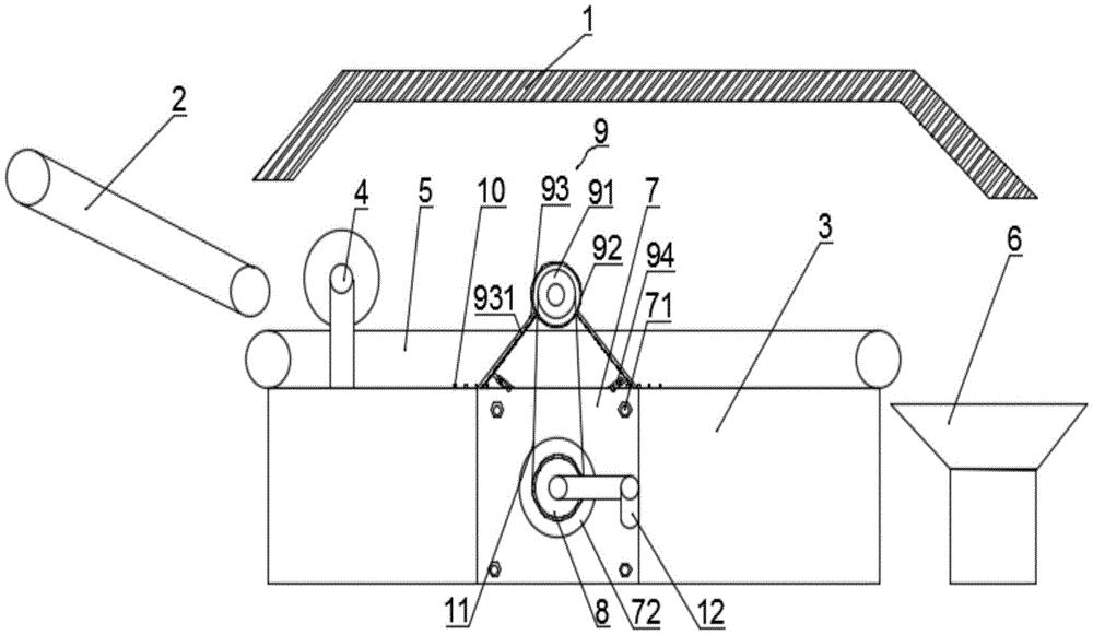 本实用新型涉及一种鱿鱼切纹装置,特别涉及于水产品加工设备领域。本实用新型包括送料装置、传送装置和收集仓,传送装置设于支撑座的上方,支撑座的上方还设有压辊装置,支撑座上设有安装板,安装板的正上方设有切割装置和卡紧件;切割装置包括切料滚筒、设于切料滚筒上环形刀片、用于支撑切料滚筒的支撑架,支撑架上设有嵌入孔。现有技术中为了追求菜色的美感,往往将鱿鱼切纹设计,本实用新型克服了现有技术中人工切纹成本较高,另一方面难以控制切割力度的缺点。本实用新型通过将鱿鱼压平之后再通过传送装置传送到切割装置切割,切割装置上设有环形刀片,环形刀片到传送装置的高度通过衔接调节柱和支撑杆进行调节,防止切断鱿鱼。