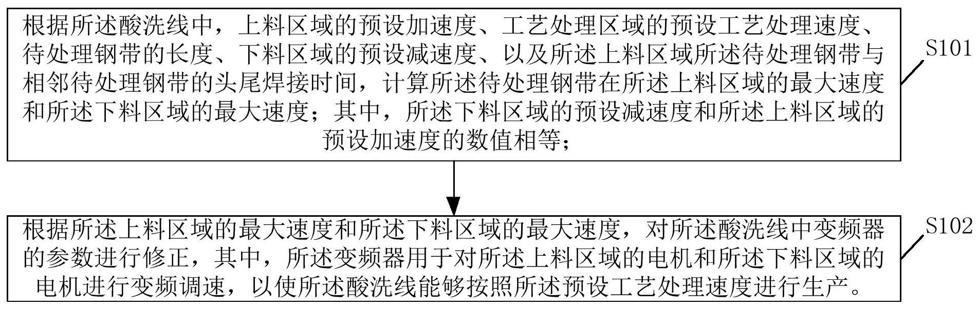 本申请提供一种不锈钢板材退火酸洗线提速方法和系统。该方法包括:上下料区域的待处理钢带最大速度计算步骤,根据酸洗线中,上料区域的预设加速度、工艺处理区域的预设工艺处理速度、待处理钢带的长度、下料区域的预设减速度、以及上料区域中待处理钢带与相邻待处理钢带的头尾焊接时间,计算待处理钢带在上料区域的最大速度和下料区域的最大速度;其中,下料区域的预设减速度和上料区域的预设加速度的数值相等;变频器的参数修正步骤,根据上料区域的最大速度和下料区域的最大速度,对酸洗线中变频器的参数进行修正,其中,变频器用于对上料区域的电机和下料区域的电机进行变频调速,以使酸洗线能够按照预设工艺处理速度进行生产。