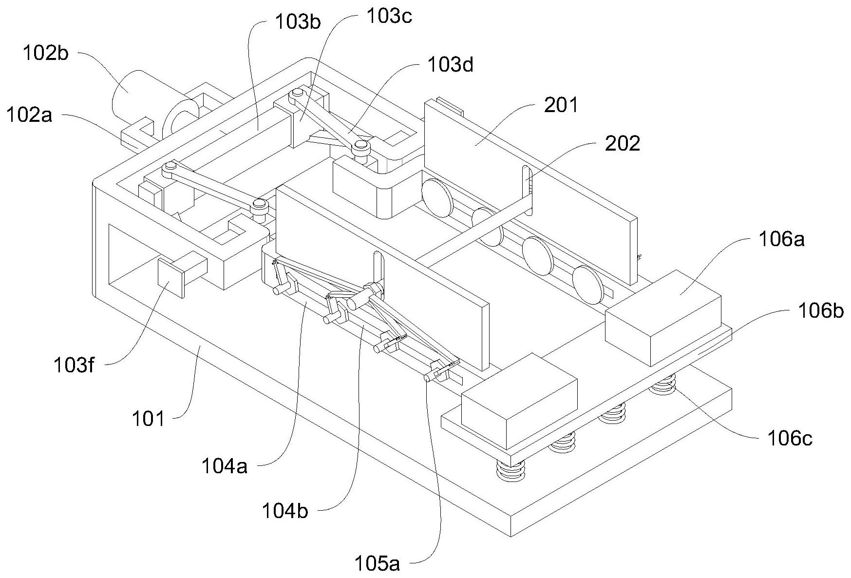 本实用新型涉及水处理技术领域,特别是一种滤膜组件固定机构及其装置,包括稳定板、设置在所述稳定板上的驱动组件、设置在所述驱动组件上的联动组件、设置在所述联动组件上的夹持组件、设置在所述夹持组件上的固定组件,以及设置在所述固定组件底部的减震组件,通过驱动组件带动联动组件进行运动,从而使得联动组件上的夹持组件相互靠近或相互远离,随后利用夹持组件上的固定组件可夹持不同尺寸的滤膜组件,且无需操作人员全程手动操作夹持滤膜组件,方便快捷。