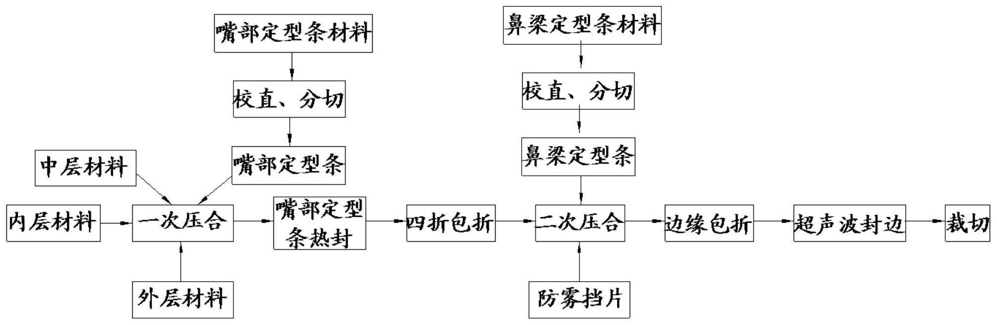 本发明公开了一种防雾气口罩的制备工艺,属于口罩技术领域,该制备工艺在先将嘴部定型条与内、外、中三层材料压合,得到预复合材料,预复合材料采用四折包折的方式对口罩进行折叠后再与鼻梁定型条、防雾挡片进行压合,最后依次进行边缘包折、超声波封边和裁切,得到防雾气口罩的面罩部。本发明提供的制备工艺,采用四折包折的方式代替传统的单向包折,得到的防雾气口罩的面罩部,能够提供更大的且立体的呼吸空间,使呼出的气体能够快速从面罩部排出,配合防雾挡片的密封,有效避免了呼出的气体从鼻子上方溢出造成的起雾现象,且制备过程中仅需两次压合,制备工艺简单、易于在现有流水线上进行改造升级,适于企业大规模生产。