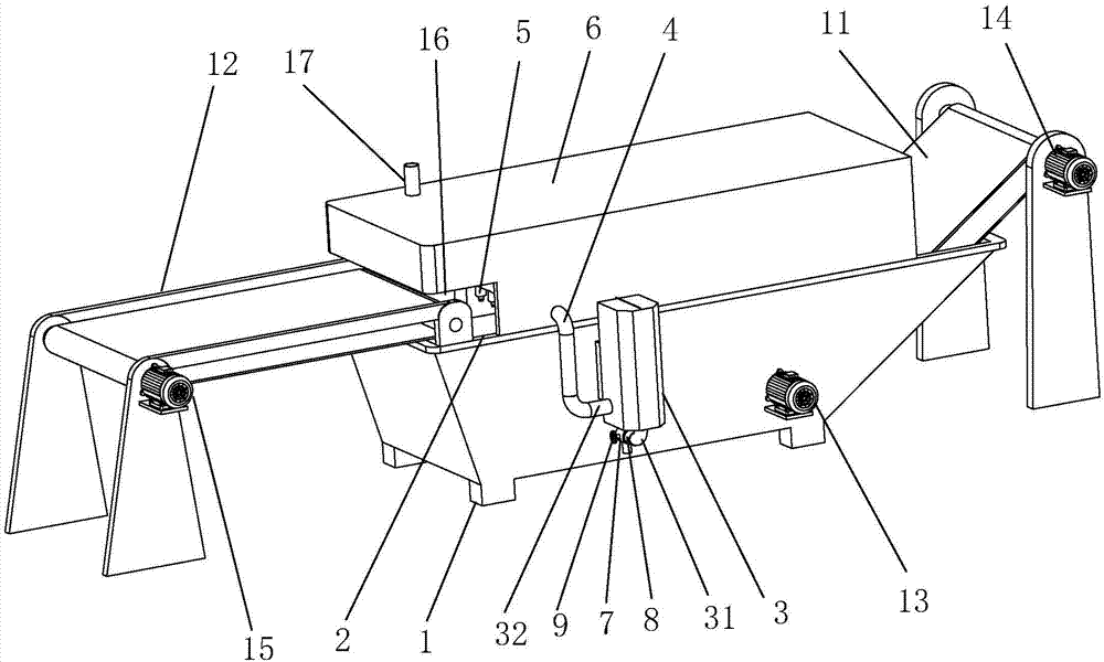 本实用新型涉及生产设备技术领域,具体涉及一种全自动包装袋清洗设备,包括机架,与机架匹配设置的机盖,设置在机架上的蓄水池,设置在机盖内表面的清洗装置,设置在蓄水池下方的循环水泵和输送装置;输送装置包括前输送装置和后输送装置,前输送装置伸入蓄水池上方,后输送装置一端设置在蓄水池内部,另一端向上倾斜伸出蓄水池;循环水泵一端连接蓄水池,另一端连接清洗装置;解决了传统清洗包装袋时,不断喷水,不断排水,浪费水资源的问题;具有清洗效果好,节约水资源的优点;并且投料与出料过程为全自动机械化操作,大大提高了工作效率,节约劳动力,降低了生产成本。