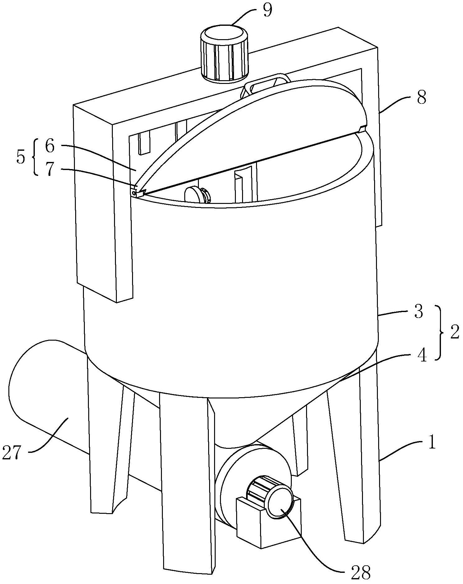 本申请涉及一种番茄原浆搅拌装置,包括支架和固定在支架的搅拌桶,所述搅拌桶上端设置有可打开的桶盖,下方连接有用于输送番茄原浆的送料装置,所述搅拌桶上设置有安装架,所述安装架上固定有驱动电机,所述驱动电机输出轴上可拆卸连接有伸入到搅拌桶内且呈竖直设置的搅拌轴,所述搅拌轴上固定有搅拌桨。驱动电机启动电动搅拌轴转动,从而使固定在搅拌轴上的搅拌桨对番茄原浆进行搅拌。本申请具有使搅拌原浆混合均匀的效果。