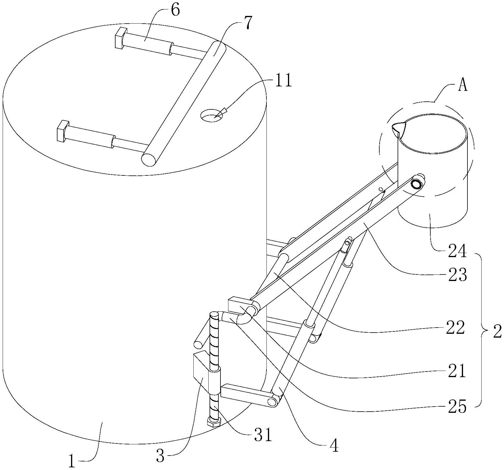 本申请涉及一种角度可调的进料辅助装置,属于进料机构的技术领域,其主要技术方案在于,包括罐体和开设在罐体上的进料口,还包括安装在罐体上的上料机构,上料机构包括铰接在罐体上的连接轴、固定在连接轴上的支撑臂,还包括铰接在支撑臂上的、能够随支撑臂的转动而移动到罐体上方的上料桶,上料桶设置有开口,所述进料口开口朝上设置。本申请具有能够方便将活性材料从罐体顶部的进料口送入罐体内的效果。