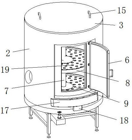 本实用新型公开了一种用于玻璃杯半成品预热的双层圆炉,包括安装在支架上的炉体,炉体顶部设有炉盖,炉体内设有加热炉盘、电炉丝,炉体外壁上设有炉门,炉体中部转动安装有转轴,转轴上间隔设有上转盘、下转盘,支架上安装有驱动电机,驱动电机与转轴伸出端相联接;炉体外壁还设有电控箱、传热管,电控箱与驱动电机电连接;传热管与炉体内腔联通,传热管向上弯曲末端设有预热板。本实用新型双层转盘分别用来放置内胆和胆壳,杜绝误拿,降低产品损伤率;传热管,对玻璃半成品进行预热,也可以作为降温平台,降低产品损伤及爆裂现象;在炉门打开时,风机开启,导风罩在炉体外壁形成风幕,确保炉内高温热气流不朝向操作人员涌来,改善操作环境。