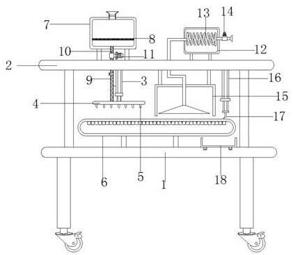 本实用新型公开了一种用于尼龙拉链成型的润滑装置,包括底板,底板顶部外壁四周均焊接有支撑杆,支撑杆顶部焊接有顶板,顶板底部外壁焊接有推杆电机,推杆电机末端焊接有储存管,储存管底部设置有等距离分布的雾化喷头,底板顶部外壁焊接有传送带,传送带位于雾化喷头下方,顶板顶部焊接有加热箱,加热箱内壁焊接有电热网,加热箱底部设置有贯穿顶板的输油管,输油管内壁焊接有电热丝。本实用新型中,加热箱中的电热网使蜡油加热熔化,形成油液,电热丝保持油液流动性,防止油液凝固,雾化喷头将油液均匀地喷涂在拉链上,延长拉链使用寿命,螺纹管增大空气与冷凝剂接触面积,低温空气对拉链进行降温,使蜡油附着在拉链上。