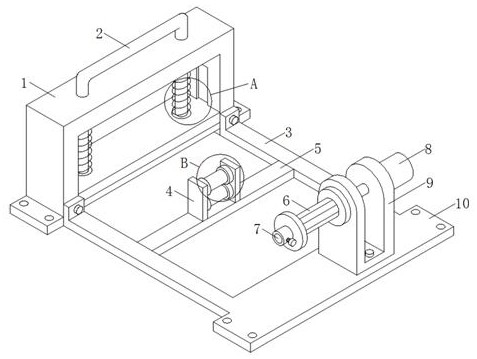 本实用新型公开了一种金属拉链冲齿机用工件固定装置,包括支架、把手、压板和底板,所述支架的顶端开设有两个供倒U形的把手穿过的通孔,所述把手的底端贯穿两个弹簧并与压板连接,所述压板的底端固定有防滑垫;所述底板朝向支架的一侧一体成型有两个连板,两个所述连板均与支架连接,两个所述连板之间固定有支板,所述支板的顶端固定有两个竖板,两个所述竖板之间设有两个导向辊;所述底板的顶端固定有U形的底座,所述底座的一侧固定有电机,所述电机的输出轴通过联轴器与横杆的一端连接,所述横杆的另一端贯穿固定在底座另一侧的轴承和圆筒。该金属拉链冲齿机用工件固定装置,方便金属拉链的固定,节省了人力。