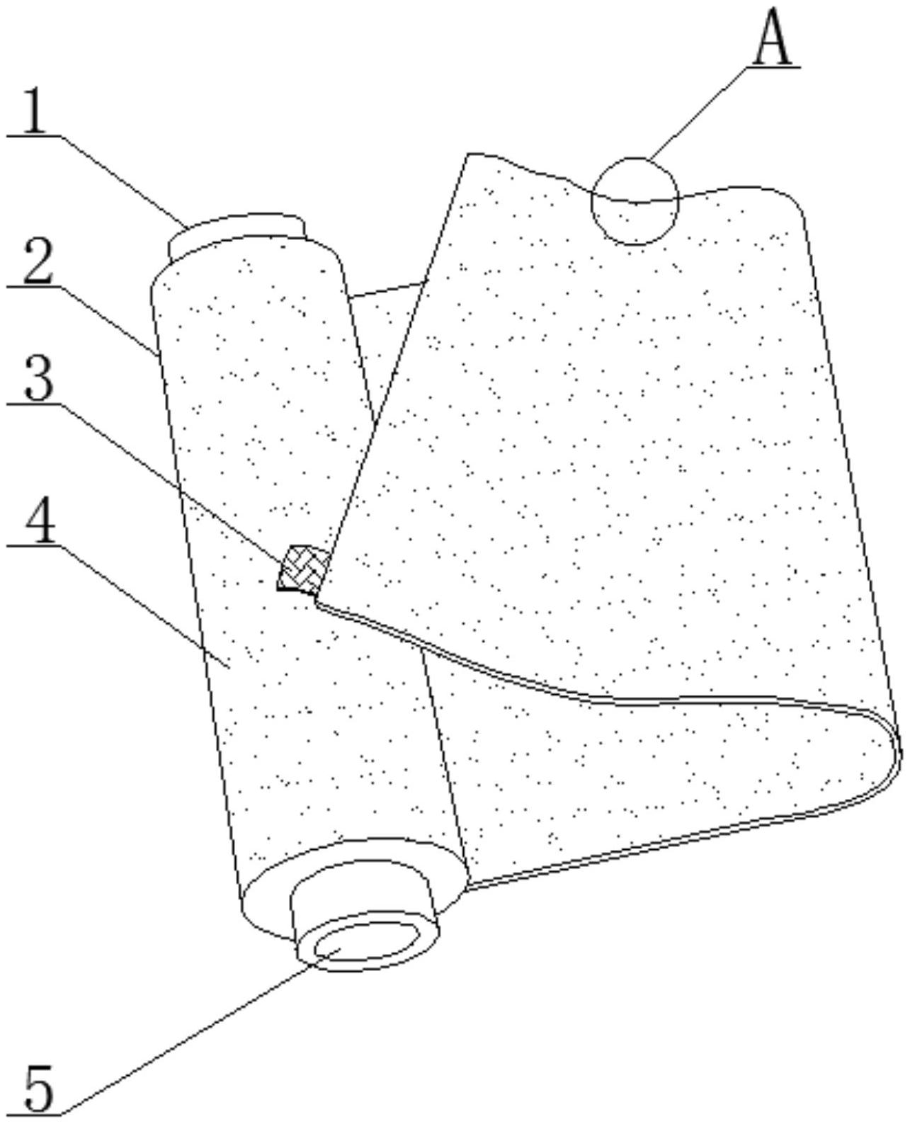本实用新型公开了一种防水阻燃丝绸面料,包括丝绸卷筒、阻挡上柱、中间圆柱、阻挡下柱、成品丝绸、第一丝绸上线、缠绕丝绸线、防水阻燃涂料、中心丝绸线、第二丝绸上线、第三丝绸下线、第四丝绸下线、缝隙孔洞、尺寸标志块、丝绸图案和卷筒凹槽,通过第一丝绸上线、第二丝绸上线、第三丝绸下线、第四丝绸下线和缝隙孔洞所组成的成品丝绸具有很好的防水阻燃性,第一丝绸上线、第二丝绸上线、第三丝绸下线和第四丝绸下线的结构相同,而第一丝绸上线是通过缠绕丝绸线、防水阻燃涂料和中心丝绸线构成,在缠绕的时候,缠绕丝绸线和中心丝绸线的外侧均浸泡过防水阻燃涂料,这样在编织的时候,使得丝绸具有很好的防水作用和阻燃性。