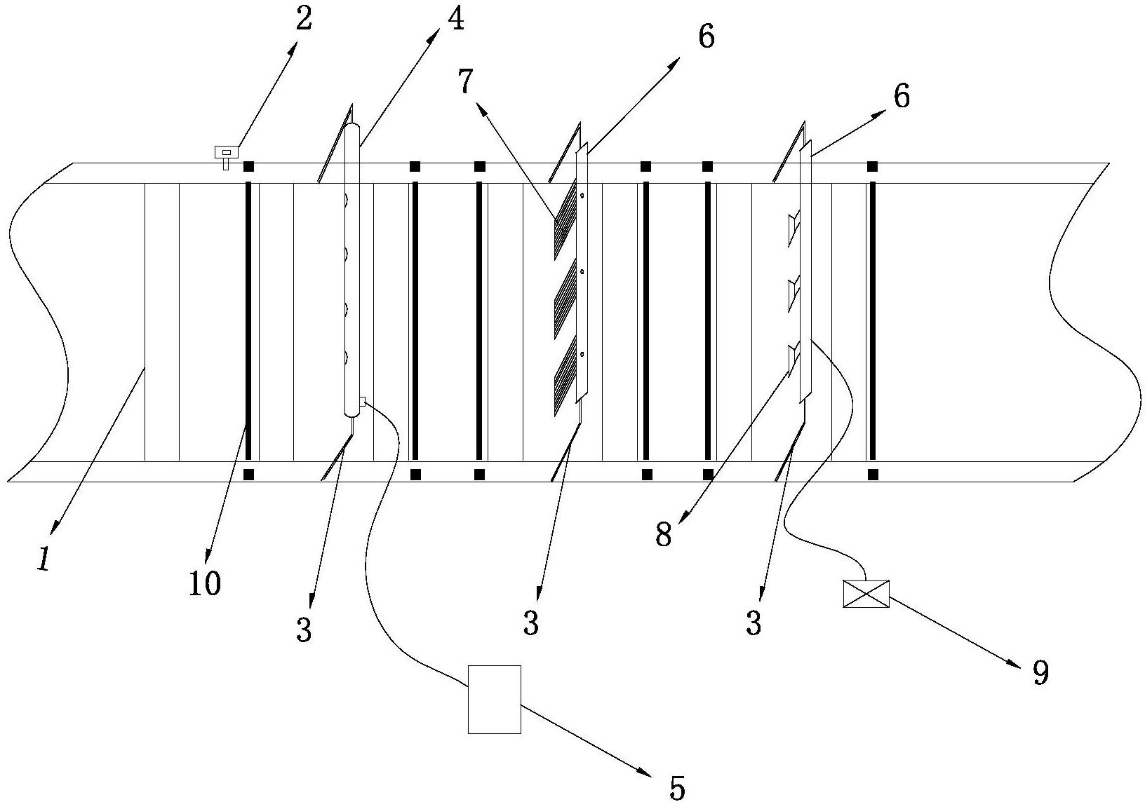 本实用新型公开了一种适用于传送带连用的表面除尘组合装置,包括:支撑架,其为竖直设置在传送带两侧的等高度杆体,所述传送带为水平安装的滚轮传送带,所述两侧等高度杆体未与传送带相接的一端的连线与传送带的运动方向垂直;除尘管,其位于传送带上方,所述除尘管两端分别可拆卸地连接在所述支撑架的两侧,所述除尘管上设置有进风孔,与传送带相对的一面设置有出风孔,所述除尘管内部为气室;空气压缩机,其与所述除尘管的进风口通过导管连接。本实用新型通过鼓吹压缩空气去除传送带上移动物体表面的渣屑与灰尘,结构简单、操作方便。