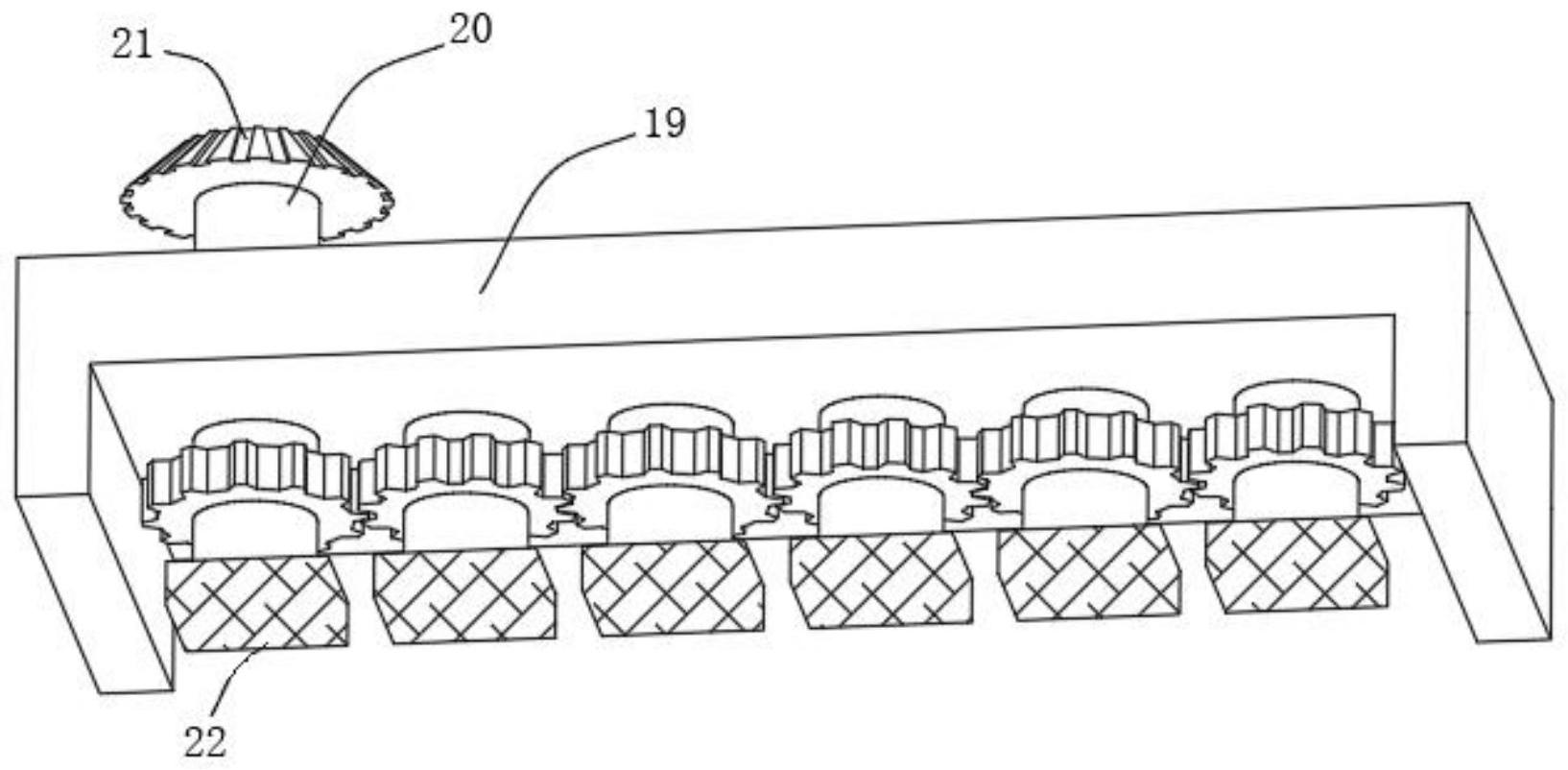 本实用新型公开了一种快速鱼块切碎装置,属于食品加工技术领域。一种快速鱼块切碎装置,包括工作台,还包括:砧板,设置在工作台的顶部;支撑板,固定连接在工作台的顶部;第一气缸,固定连接在支撑板的顶部;刀片,设置第一气缸的输出端上;刷盖,设置在砧板的顶部;第二连接轴、连接轴,转动连接在刷盖上;钢丝球,固定连接在第二连接轴和连接轴上;第二锥齿轮,固定连接在第二连接轴上;第二电机,设置在工作台的侧壁;第二转轴,连接在第二电机的输出端;第一锥齿轮,连接在第二转轴上,且与第二锥齿轮啮合相连;本实用新型结构简单,使用方便,可以对砧板进行充分的刷洗,省时省力,降低细菌滋生的风险。