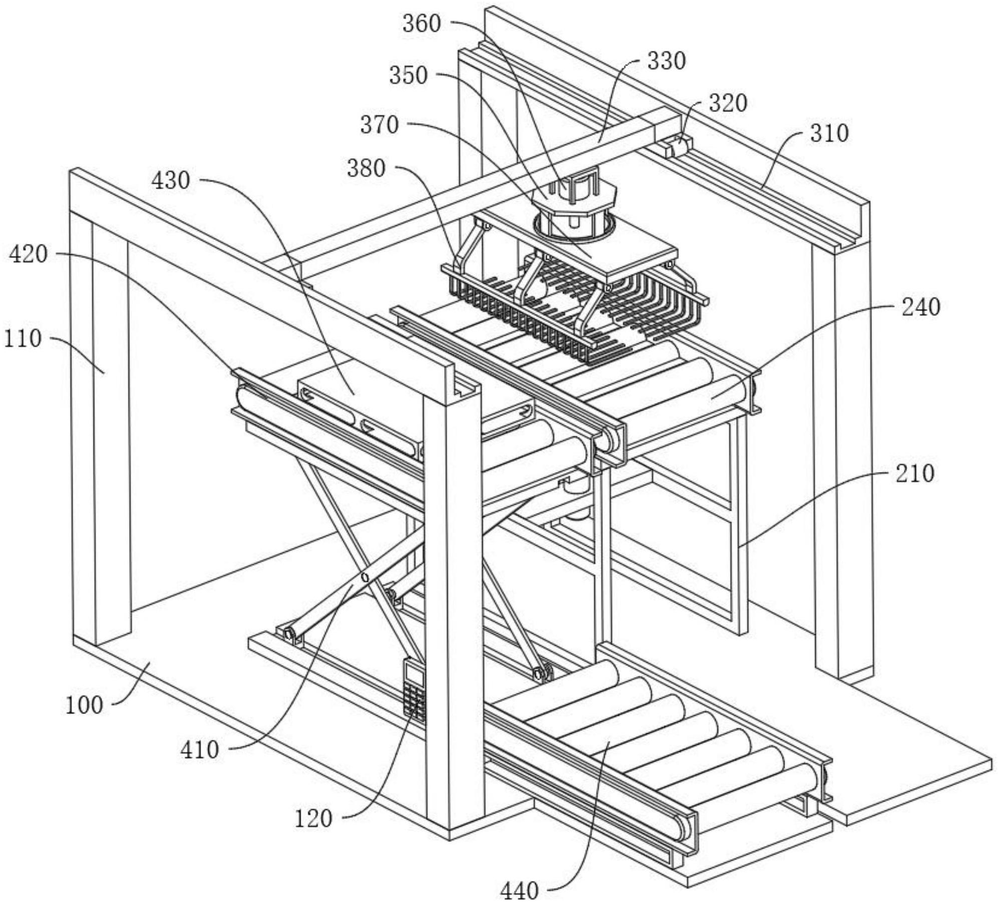本实用新型公开了一种食品添加剂加工用堆垛装置,包括底座,所述底座的外侧通过螺栓固定有安装柱,所述底座的顶部设置有上料机构和放置机构,所述安装柱的顶部设置有搬运机构,所述搬运机构包括安装滑轨、驱动轮、安装横杆、驱动电机、丝杆、连接架、旋转电机、夹持底座和夹爪;通过设置有上料机构对食品添加剂进行上料操作,设置有搬运机构,通过夹爪将食品添加剂搬运至放置机构上,以上机构配合实现对食品添加剂的自动化堆垛操作,提高了堆垛操作的自动化和效率,保证了对食品添加剂夹持的牢固性,具有较高的夹持准确性,提高了对食品添加剂夹持搬运的准确度,保证了食品添加剂堆垛后的稳定性,提高了装置的实用性。