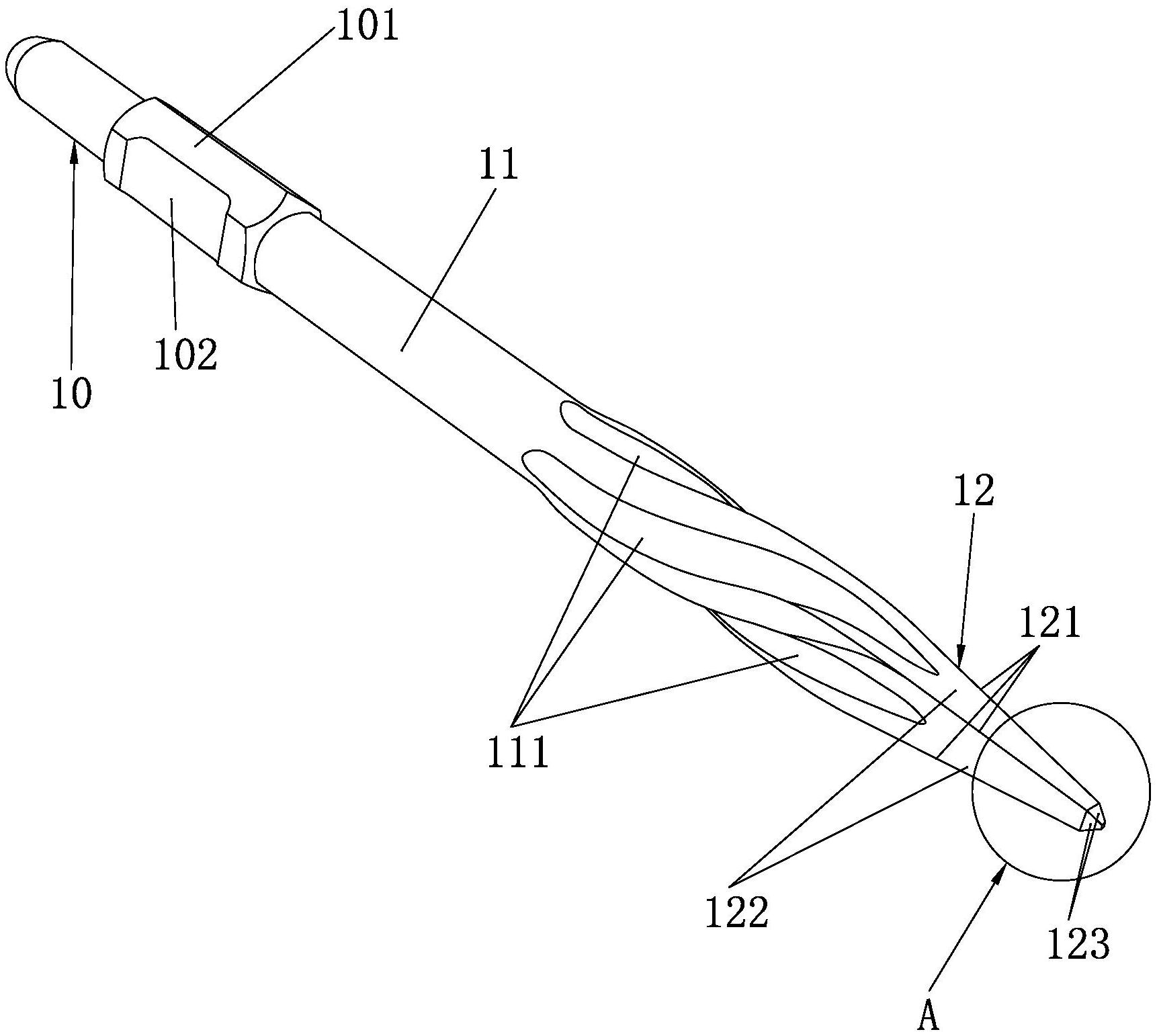 本实用新型涉及一种螺旋自磨尖凿,包括凿柄、凿体、凿尖,凿尖的外壁上形成有四根对称分布的棱边,四根棱边向凿体延伸且形成有四个工作面,所述的凿尖的顶部具有与四个工作面相连接的四个锐利斜面,所述的凿体上设置有四条螺旋状排屑槽,所述的各排屑槽的一端分别延伸在四个工作面上。本实用新型具有结构简单、性能稳定可靠、钻凿效率高、寿命长的优点。