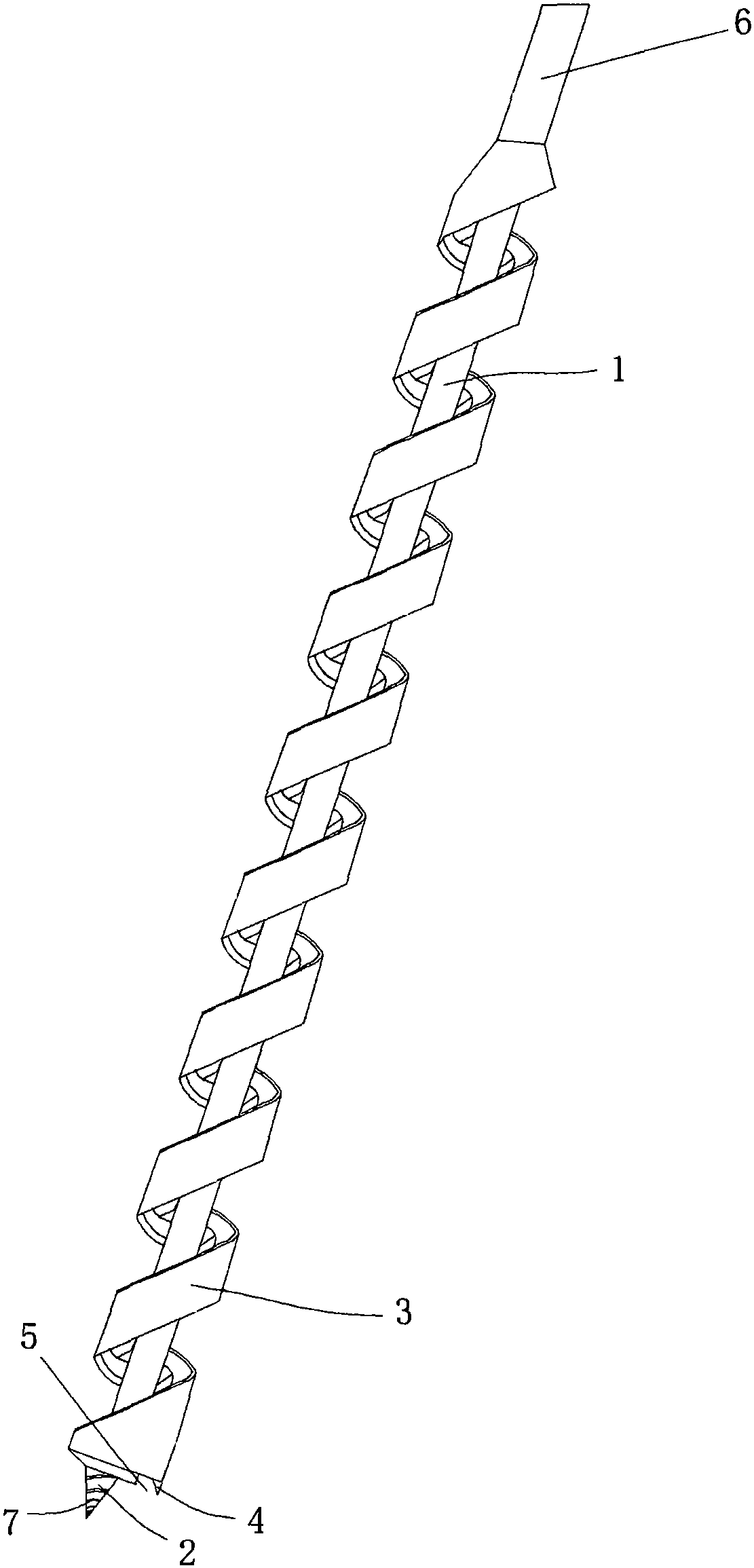 本实用新型公开了一种排屑型厚木板钻孔用钻头,包括钻杆和设置在钻杆前端的钻尖,在钻杆的外侧固定有螺旋导屑板,螺旋导屑板的截面为T形且T形的竖杆底端一体成型在钻杆的外壁上,在螺旋导屑板的底端固定有齿尖,齿尖的高度低于钻尖的高度且钻尖与齿尖之间设置有间隙,在钻杆的顶端固定有方形的连接部,在钻尖的表面设置有螺旋齿。本实用新型的结构设置合理,其不但操作便捷,可有效的进行导屑,同时设置有齿尖,可有效的进行钻孔及护孔操作,有利于提高钻孔的效率与钻孔的精度,使用稳定性好且适用性强。