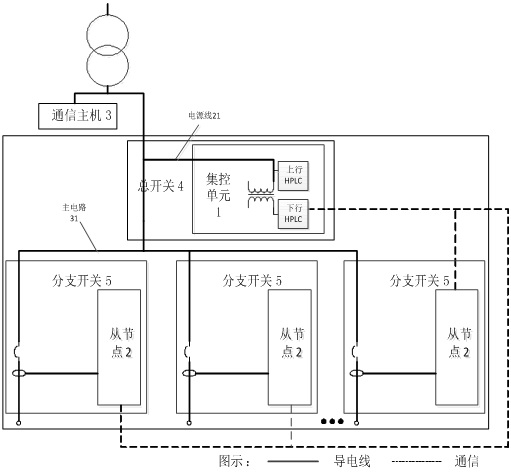 本申请提供了一种应用HPLC通信子网络的低压配电台区通信网络,包括集控单元(1)、从节点(2)、通信主机(3)。集控单元(1)接收多个从节点(2)的信息,通过缓冲处理后,传递给通信主机(3),集控单元(1)与多个从节点(2)构成一个通信子网络,通信方式采用HPLC。从节点(2)接收来自集控单元(1)的设置信息、控制信息,并传递给总开关(4)和/或分支开关(5);集控单元(1)上行信道与下行信道物理隔离,集控单元(1)具有中继功能,还可以向从节点(2)提供电源,HPLC通信子网络还作为集控单元(1)向从节点(2)供电的网络。