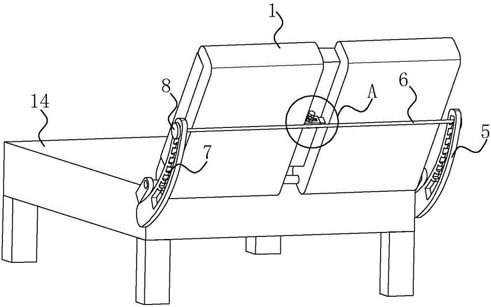 本实用新型公开了一种床,旨在解决床头屏难以调节的问题,其技术方案要点是:一种床,包括床架,转动连接于床架端部的床头屏;以及设置于床架的端部、用于承托床头屏并调节床头屏与床架之间角度的调节装置;用户在床架上需要倚靠时,可将身体倚靠在床头屏,由于用户之间的身材存在较大差异,故使用调节装置将屏本体调节至适应用户身体的对应角度,使得用户在使用时更加舒适、合理,符合人性化设计。