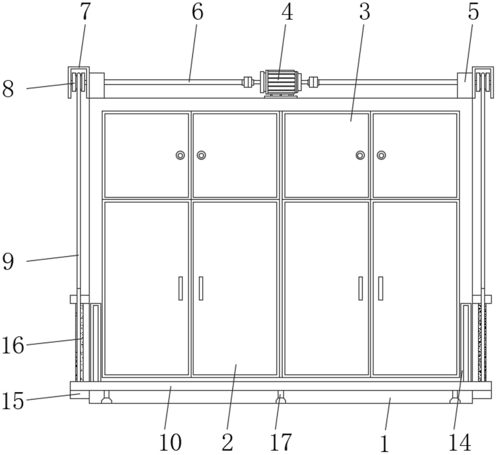 本实用新型涉及酒店家具技术领域,且公开了一种酒店用防噪声木质柜,包括柜体,所述柜体的正面设置有第一柜门和第二柜门,所述柜体的顶部固定安装有双轴控制电机,所述柜体的顶部固定连接有两个轴承座,两个所述轴承座的内部均活动连接有连接杆。该酒店用防噪声木质柜,通过轨道、连接块、滚轮、滑道、固定块和固定杆之间的相互配合,从而可以对U型垫板进行限位,使得U型垫板只能进行上下移动,且通过双轴控制电机工作带动两个连接杆转动,并使得滑轮转动,从而对拉绳进行收卷或放出,进而使得U型垫板可以进行上下移动,使得住客可以将第二柜门进行打开,便于将物品从顶部的衣柜格内部进行拿取或放置进去。