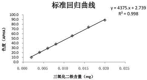 本发明公开了一种工业用氢氧化钠中铁含量的检测方法。具体地,本发明采用双酚A甲醇溶液与含铁的氢氧化钠试样混合,根据显色情况建立APHA色度与三氧化二铁含量的标准曲线,通过由直接测试色度而得到试样品三氧化二铁含量的方法。该方法操作在双酚A不发生变更时可不需要重复进行标准曲线的制作,步骤简单,对试剂无避光要求,误差小。
