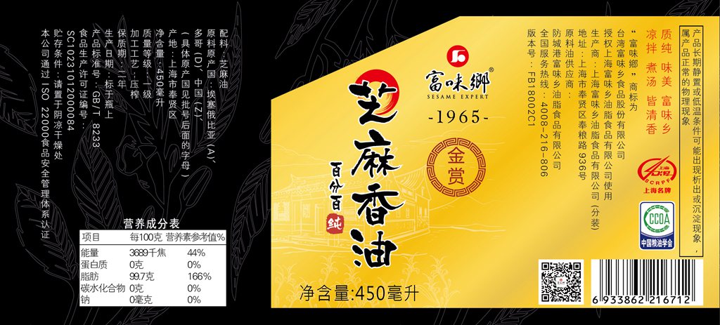 1.本外观设计产品的名称:标贴(富味乡金赏芝麻香油450ml)。2.本外观设计产品的用途:本外观设计产品用于盛放食品包装瓶的标贴。3.本外观设计产品的设计要点:在于产品的整体形状。4.最能表明本外观设计设计要点的图片或照片:主视图。5.省略视图:因是平面设计图,故省略后视图,左、右视图,俯、仰视图。