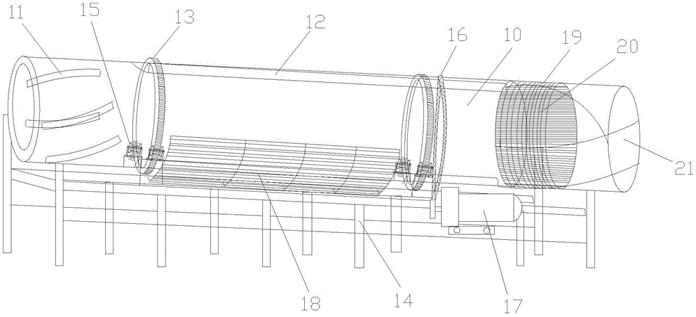 本实用新型涉及机械设备技术领域,特别涉及一种辣椒连续清洗机,包括:清洗机,其靠近进料口一端的内壁固定设置若干第一推料件,第一推料件围绕清洗机的轴线中心对称分布,第一推料件为U型板。本实用新型实施例提供的一种辣椒连续清洗机,通过在靠近清洗机进料口一端的内壁固定设置若干第一推料件,第一推料件为U型板,U型板的弧面朝向清洗机中心,在清洗机转动时,辣椒与第一推料件的弧面接触,避免第一推料件对辣椒挤压,减少辣椒破损的几率。