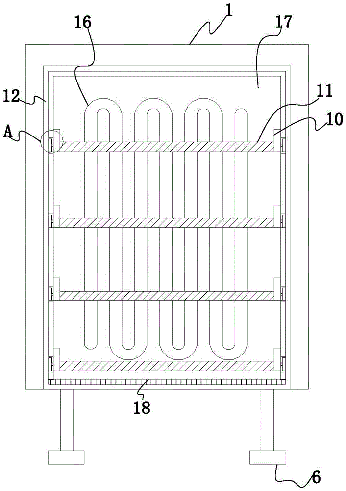 本实用新型公开了一种牛肉酱生产原料的储存装置,包括箱体、水箱、放置架、隔热板和循环管,箱体底部固定连接有底座,箱体内部设有降温室,降温室固定连接在箱体内壁上,水箱固定连接在箱体背部,水箱底部固定连接有水泵,循环管与水泵固定连接,箱体内部设有存放室,存放室底部设有干燥层,箱体前端通过合页活动连接有箱体门,箱体门外侧固定连接有把手,放置架上连接有支撑板,两个支撑板在远离放置架的一侧固定连接有滑杆,滑杆顶端与滚轮活动连接,该牛肉酱生产原料的储存装置,通过设置水箱、循环管可以利用循环水吸收箱体内部的热量,利用干燥层防止原料潮湿影响酱料的口感,解决了温度高导致变异、发霉、原料质量降低的问题。