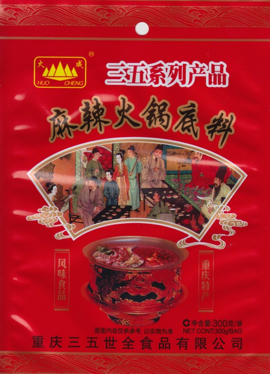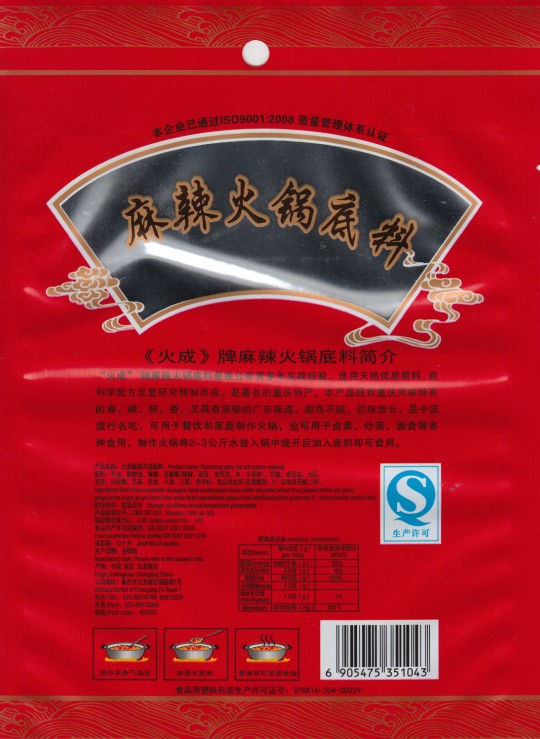 1、该外观设计产品的名称是:包装袋(火成麻辣火锅底料);2、该外观设计产品的用途:食品包装袋;3、该外观设计的设计要点:色彩与图案的结合;4、该外观设计请求保护的外观设计包含色彩;5、该外观设计为平面产品,省略其它视图;6、指定最能表明该外观设计的设计要点的图片或照片:主视图。