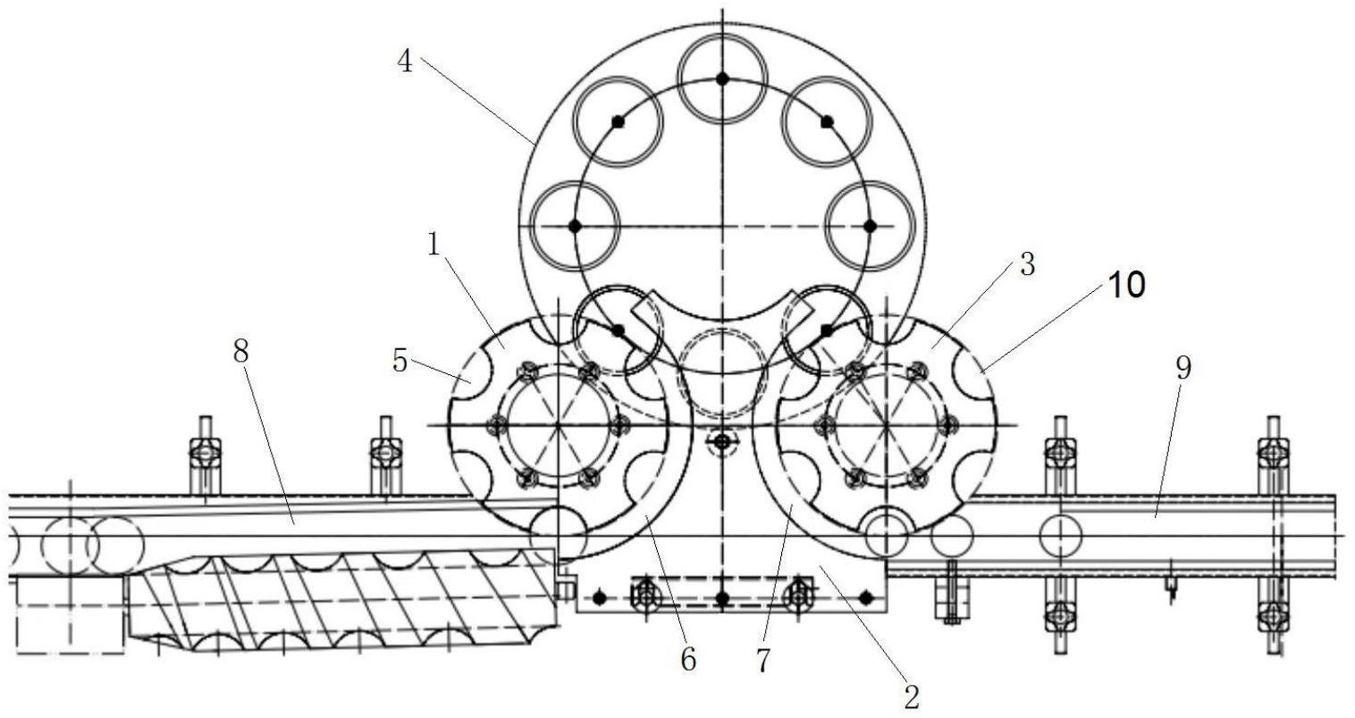 本实用新型提出了一种小磨香油包装用灌装多规格转换装置,包括进瓶星轮、中心导向板以及出瓶星轮,进瓶星轮和出瓶星轮位于中心导向板的两侧,进瓶星轮的外圈边缘设置有进瓶容纳半槽结构,出瓶星轮的外圈边缘设置有出瓶容纳半槽结构,中心导向板的两侧分别设置有进瓶星轮容纳腔、出瓶星轮容纳腔,进瓶星轮位于进瓶星轮容纳腔中,出瓶星轮位于出瓶星轮容纳腔中。本实用新型工作时,进瓶星轮不断地将产品输入到压盖设备进行压盖,规格转换时,只需将进出瓶星轮进行更换安装,就能实现另一规格的作业,操作方便简单,既能在一台设备上实现多种规格的生产,又能减少同样设备的重复投入及环境空间,达到一机多用的效果。