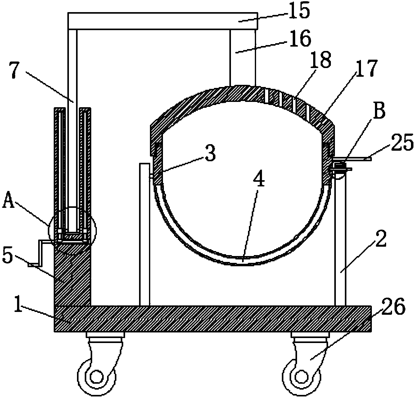 本实用新型公开了一种玉米粳煮料锅,包括底座,所述底座的上端对称设有支撑杆,两个所述支撑杆之间转动连接有煮料锅,其中一个所述支撑杆还通过固定装置与煮料锅固定连接,所述煮料锅中设有加热腔,所述底座的上端还设有连接块,且连接块靠近底座的上侧侧壁边缘处设置,所述连接块中设有开口向上的凹槽,且凹槽中插设有升降杆,所述连接块中设有横向设置的第一转槽,且第一转槽中转动连接有第一螺纹杆,所述连接块中还对称设有竖直设置的第二转槽,且第二转槽中转动连接有第二螺纹杆,所述第二螺纹杆通过斜齿轮与第一螺纹杆传动连接。本实用新型操作简单,煮料锅用的锅盖设置为可升降式,增加了装置的安全性能。