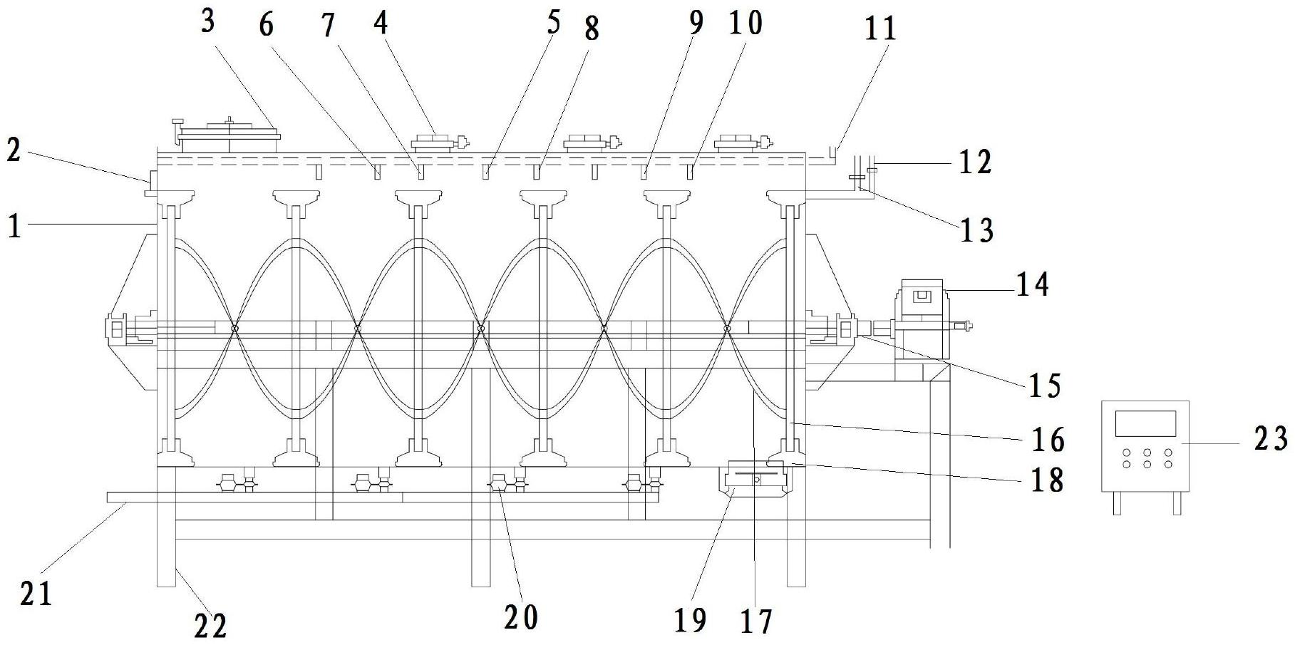 本实用新型公开了一种智能化双螺带式酿醋一体机。智能化双螺带式酿醋一体机主要包括罐体、保温夹层、进料口、通气口、搅拌装置、监测装置、喷淋装置、出醋装置、出料口、PLC自动控制系统等。其中罐体为倒拱门形;保温夹层在罐体外围,夹层内布满盘管,可通入蒸汽及冷却水控制罐体内部的温度;进料口及通气口位于罐体顶部;搅拌装置、监测装置及喷淋装置设于罐体内部;出醋装置、出料口位于罐体底部;PLC自动控制系统与物料的搅拌、各管路的开闭及罐内的监测装置相关联。山西老陈醋酿造过程中的拌醅、醋酸发酵、熏醅和淋醋工序可在该设备内完成,实现了山西老陈醋的智能化、一体化、高效化生产。