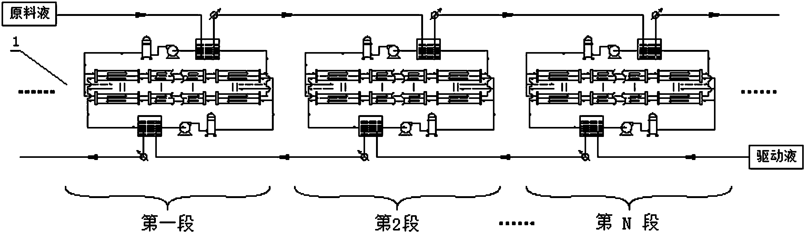 本实用新型提供一种多段式正渗透浓缩装置,属于海水浓缩制盐技术领域,该装置由N段正渗透单元串联构成多段正渗透浓缩装置,N取大于1的自然数;正渗透单元包括原料液储存器和原料液泵送管路、驱动液储存器和驱动液泵送管路,段前承接原料液进入管路连接所在正渗透单元上游段正渗透单元的段后承接原料液排出管路;段后承接原料液排出管路连接所在正渗透单元下游段正渗透单元的段前承接原料液进入管路;每个正渗透单元的段内正渗透膜组的原料液经程和驱动液经程之间形成膜间错流,进行膜间物质交换;正渗透单元以单元段为单位上下游串接构成段内循环浓缩的多段式正渗透浓缩装置。本装置可大幅提高劳动生产率,降低土地占用面积。