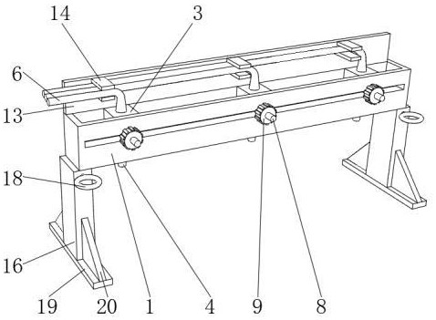 本实用新型涉及滴灌装置技术领域,公开了一种种植用可变滴灌间距的滴灌装置,包括支架,所述支架的底部固定连接有支板,所述支架的中部滑动连接有滑块,所述滑块的底部固定连接在滴灌头的顶部,所述滑块的顶部固定连接在插管的底部,所述插管的外侧设置有进水管,所述支架前侧的中部设置有卡槽,所述卡槽的内壁设置有螺纹杆,所述螺纹杆的一端固定连接在滑块前侧的中部,所述螺纹杆另一端的外侧螺纹连接有压板。本实用新型中,通过旋转压板使其远离支架,此时可通过拨动螺纹杆带动滑块在支架的内部滑动,从而可调节滑块和滴灌头在支架上的位置,进而可调节相邻两个滴灌头的间距,提高实用性。
