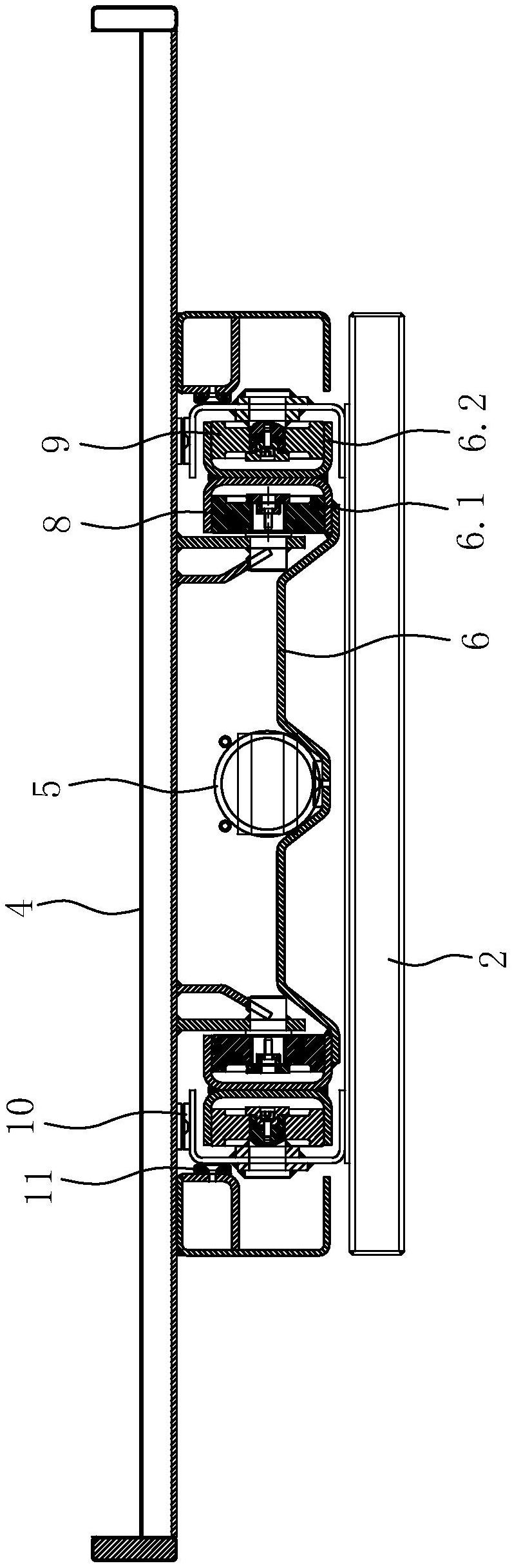 本实用新型公开一种清障车的三折平板机构,包括有车架、副车架、顶升副车架倾斜的倾斜油缸、与副车架滑动连接的三折平板、以及驱动三折平板滑动的行程倍增平移机构及伸缩油缸,行程倍增平移机构包括滑动架以及链条传动机构,滑动架具有两侧槽口相对的容置支承三折平板的第一滚轮滑动的第一滑槽,其特征在于:滑动架设有与第一滑槽背向固定的第二滑槽,副车架纵梁安装容置在第二滑槽滑动的第二滚轮。由于本实用新型清障车采用了滚轮来支承滑动架滑动,使得载车平板的滑动更加顺畅。