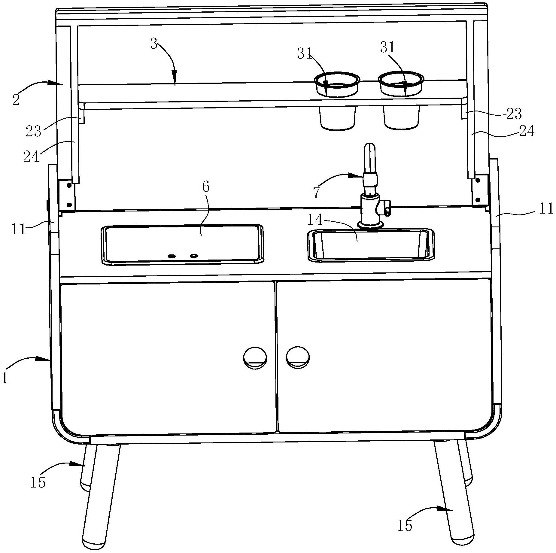 本实用新型涉及一种能变形的厨房玩具,包括操作台;置物架,包括安装在操作台上的立板以及设于立板上的置物板;所述立板能活动地安装在操作台上,所述置物板能活动地安装在立板上,所述置物架能处于第一位置或者第二位置;在置物架处于第一位置的状态下,所述立板竖向设置,置物板水平设置,置物板上能够放置物品;在置物架处于第二位置的状态下,所述立板水平设置并置于操作台的上表面,所述立板的上表面能够放置物品,所述置物板与立板相贴合并位于立板和操作台的台面之间。本实用新型在具有玩具功能的同时又具有家具的功能,故利用率高,实用性强,更能满足人们的使用要求。