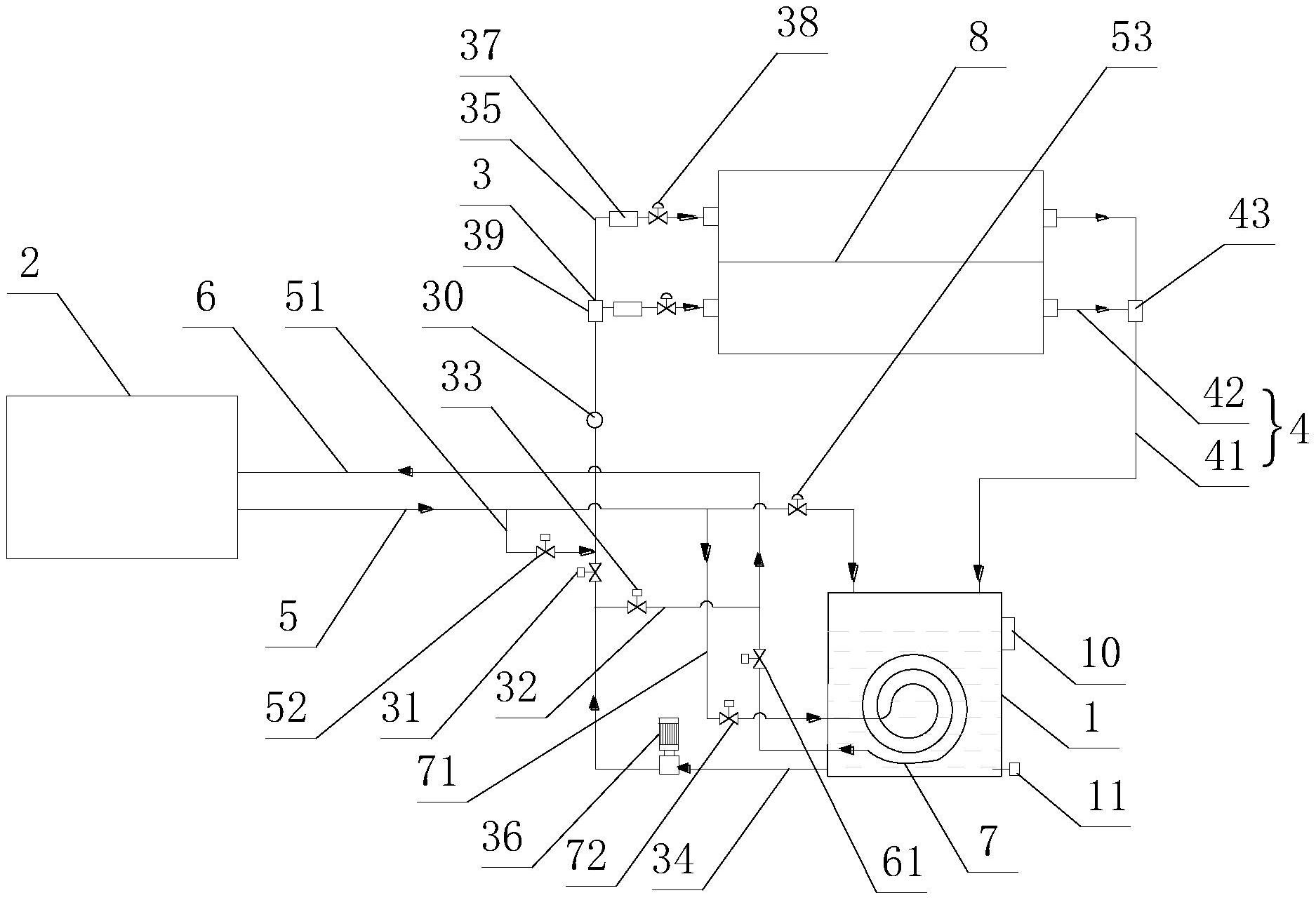 本实用新型涉及一种膜转移施胶辊的冷却水温度平衡装置,包括蓄水箱和冷却水供应池,蓄水箱上设有进水管道,蓄水箱内设有盘管,盘管的一端通过连接管与供水管相连,连接管上设有第一开关阀,盘管的另一端设有回水管,进水管道上设有温度传感器,蓄水箱的外侧壁上设有控制器;本实用新型的优点:由于进水管道上设有温度传感器,因此,能实时的采集进水管道内冷却水的温度,并将温度信号发送至控制器内,当检测到冷却水的温度超过45℃时,控制器能自动的打开第一开关阀,冷却水供应池内的冷却水通过盘管对蓄水箱内水进行冷却,并通过回水管回流至冷却水供应池内,从而实现了蓄水箱内温度的调节,能确保施胶辊冷却水温度一直控制在工艺范围内。