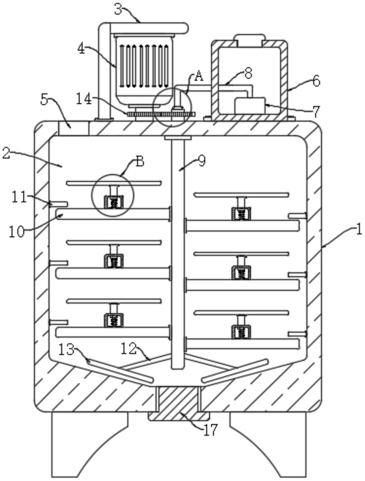 本实用新型公开了高吸附性硅胶猫砂自动凝胶装置,包括箱体,所述箱体内设有加工腔,所述箱体的上端设有进料口,所述进料口的上端与加工腔的顶部空间相连通,所述箱体的上端安装有安装架,所述安装架上安装右端电机,所述电机的输出轴上固定套设有第一齿轮,所述箱体的上端转动连接有转动管,所述转动管上固定套设有第二齿轮,所述第一齿轮和第二齿轮相互啮合。该装置通过进料机构将硫酸溶液导入至硅酸钠溶液内部各层,增加了两个溶液的接触面积,即提高了反应效率,并且抖动机构能够实现上下搅拌液体,进一步提高了混合反应的效果,转动杆能够对加工腔的底部的溶液进行搅拌,避免底部溶液搅拌不均匀。
