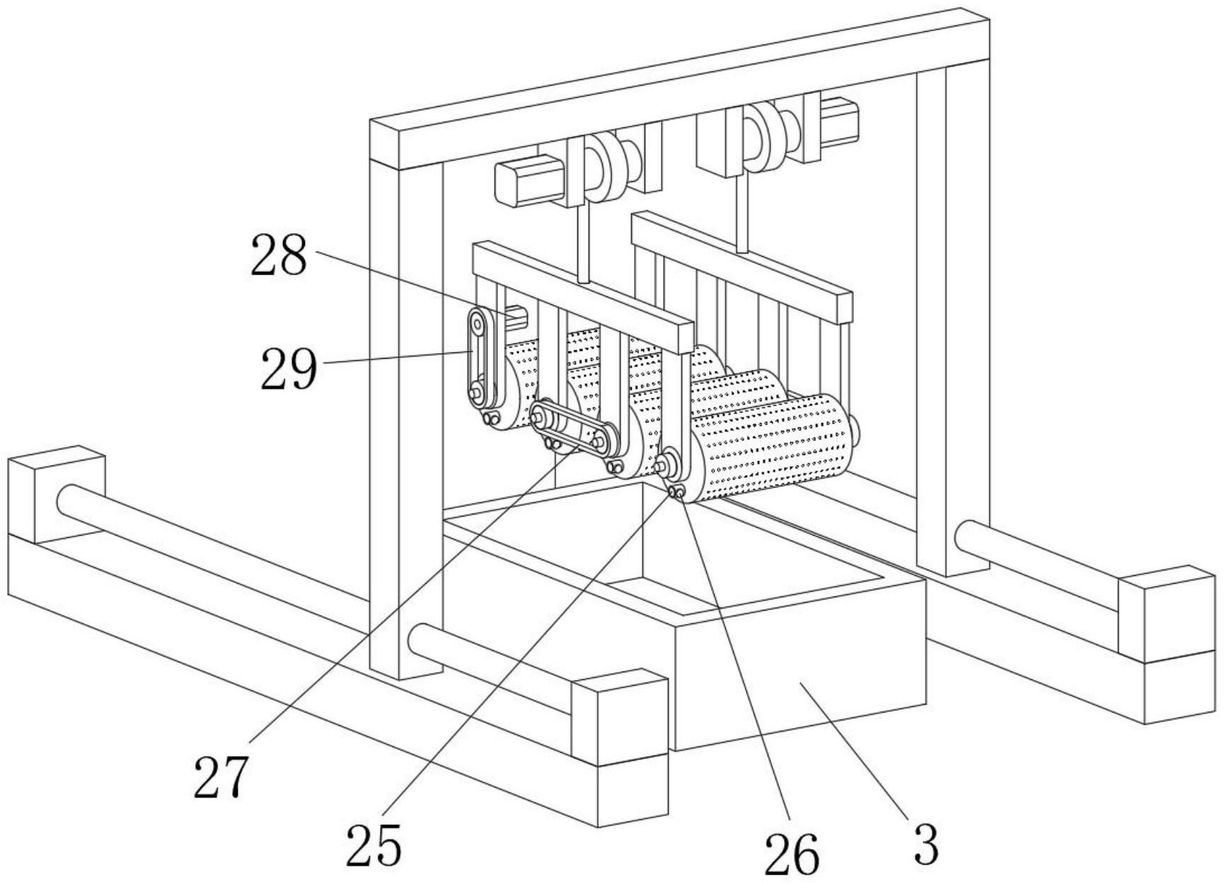 本实用新型公开了一种硅胶猫砂生产用水洗设备,包括龙门架、清洗机构和清洗池,所述龙门架上固定连接有两个电动葫芦,两个所述电动葫芦下端均通过连接绳固定连接有安装架,所述清洗机构包括多个清洗筒,多个所述清洗筒均固定套接在两个安装架之间,多个所述清洗筒外壁上均固定开设有滤孔,多个所述清洗筒内均转动设置有搅拌轴,多个所述搅拌轴外壁上均固定套接有搅拌叶片,多个所述清洗筒前端面靠下位置处均固定开设有出料口,多个所述滤孔均匀分布设置在清洗筒表面上。本实用新型所述的一种硅胶猫砂生产用水洗设备,能够充分对硅胶猫砂进行清洗,清洗效果好,且清洗后方便上下料,具有实用性。