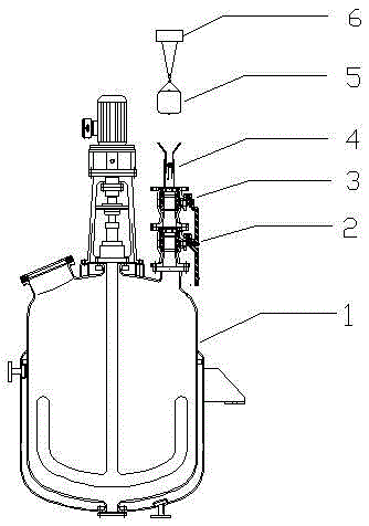 本实用新型涉及一种高压釜固体加料装置。该装置解决了目前高压反应釜在加料过程中存在费工费力的问题,实现了便捷高效添加物料。本装置采用一个带可伸缩套管的加料漏斗和两个高压球阀门替代传统的螺栓紧固的人工操作开关的加料盖。本实用新型装置具有自动化操作,大量减少人工操作和提高加料速度及效率等优点。