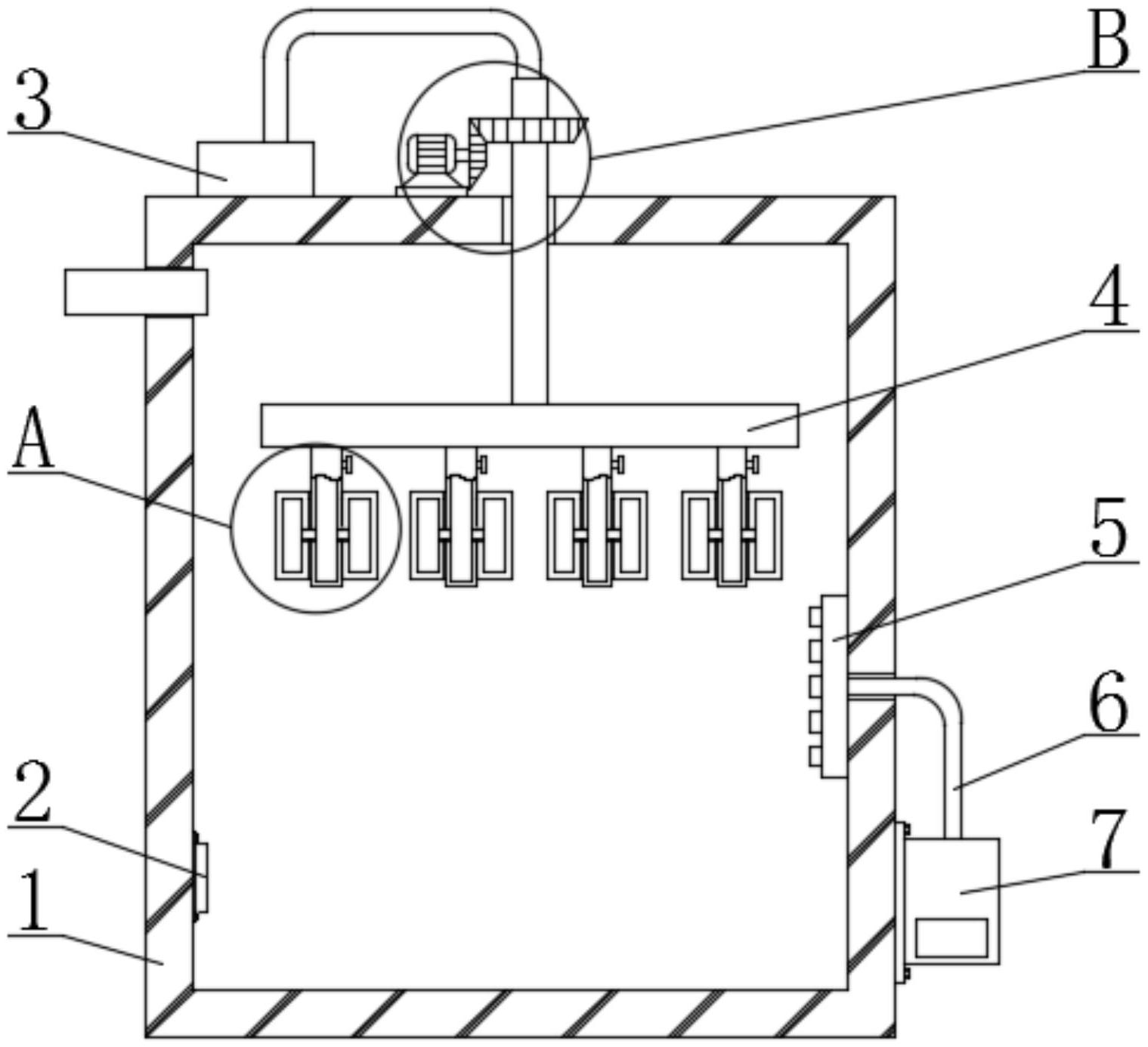 本实用新型公开了一种丁腈胶乳手套全表面快速去除水分的干燥系统,包括干燥箱,所述干燥箱顶部转动插接有中空的转动轴,所述转动轴底部固定连接有固定盘,所述固定盘底部固定连接有若干固定管,所述固定管表面固定套接有气囊环,所述气囊环内壁通过连接管与固定管连通,所述固定管内部并位于气囊环顶部固定安装有调节阀,所述转动轴表面并位于干燥箱外部固定安装有驱动机构,所述干燥箱顶部固定安装有气泵,所述气泵与转动轴之间固定连接有气管,本实用新型有效的解决了传统的方法将丁腈手套放置在烘干机内部的放置架上,放置架与接触丁腈手套相邻一侧,容易烘干不均匀,而且会导致烘干效率较低的问题。