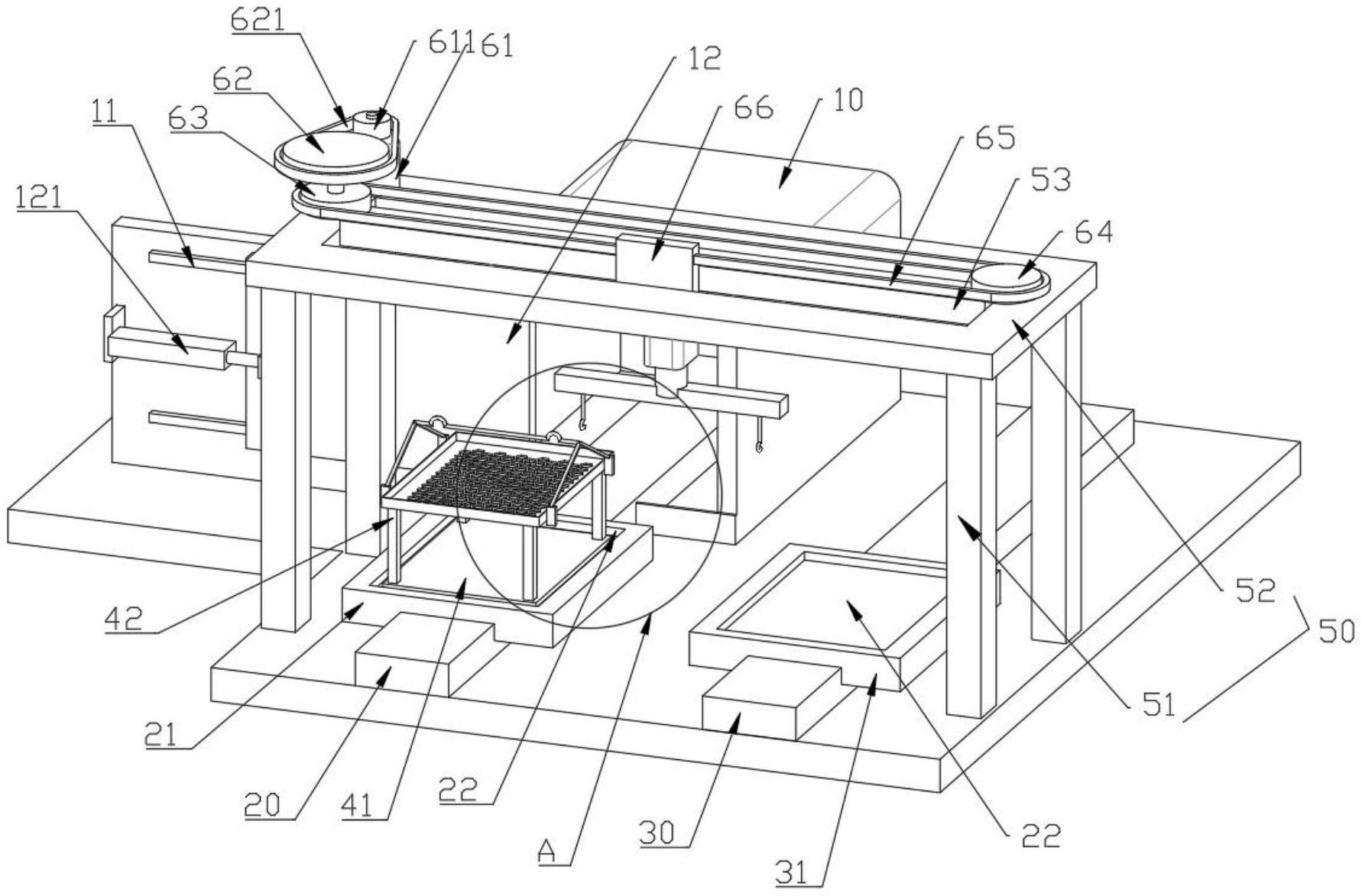 本实用新型涉及热处理加工技术领域,具体涉及一种螺栓加工的热处理装置,包括热处理炉体、第一轨道、第二轨道、第一门型支架以及第一驱动组件;所述第一轨道的一端延伸至所述热处理炉体内,且所述第一轨道上滑动安装有第一台车,第二轨道平行于所述第一轨道设置,且所述第二轨道上设有第二台车,第一门型支架上设有水平地设置有滑动吊轨,所述滑动吊轨上滑动安装有移动座,所述移动座的底部设有吊装组件,所述热处理箱可第一驱动组件的驱动下在第一台车和第二台车之间进行转移。所述螺栓加工的热处理装置便于对螺栓进行热处理加工,且加工的自动化程度较高,便于降低加工成本,提高加工效率。