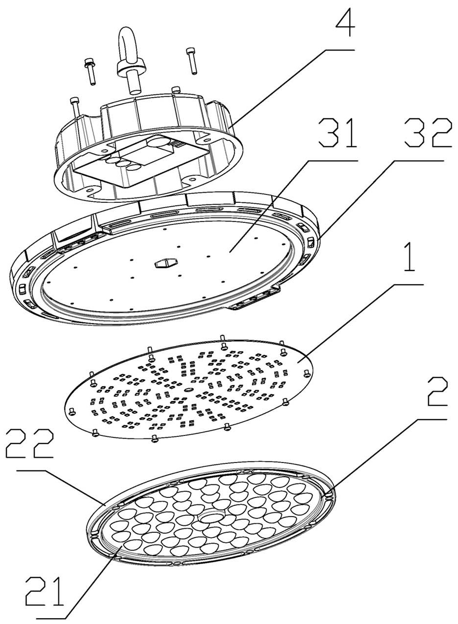 本实用新型涉及LED照明技术领域,具体说是一种LED工厂灯具。包括基板、覆盖在基板上的灯罩,基板背面紧密贴附在散热盘上,散热盘为圆盘状结构,散热盘包括具有平整下表面的中心部和环绕中心部带有环形卡槽的边缘部;基板通过螺丝固定连接在散热盘的中心部;灯罩的边缘带有卡装在边缘部环形卡槽中的卡扣;散热盘的上表面带有散热翅片和螺纹孔;端盖通过所述螺纹孔中的螺栓固定连接到散热盘的上表面。该灯具结构合理,复合散热材料紧密贴合、接触面积大、导热效率高,保证散热效果的同时具有较好的绝缘性能,彻底杜绝触电危险,使用安全可靠。
