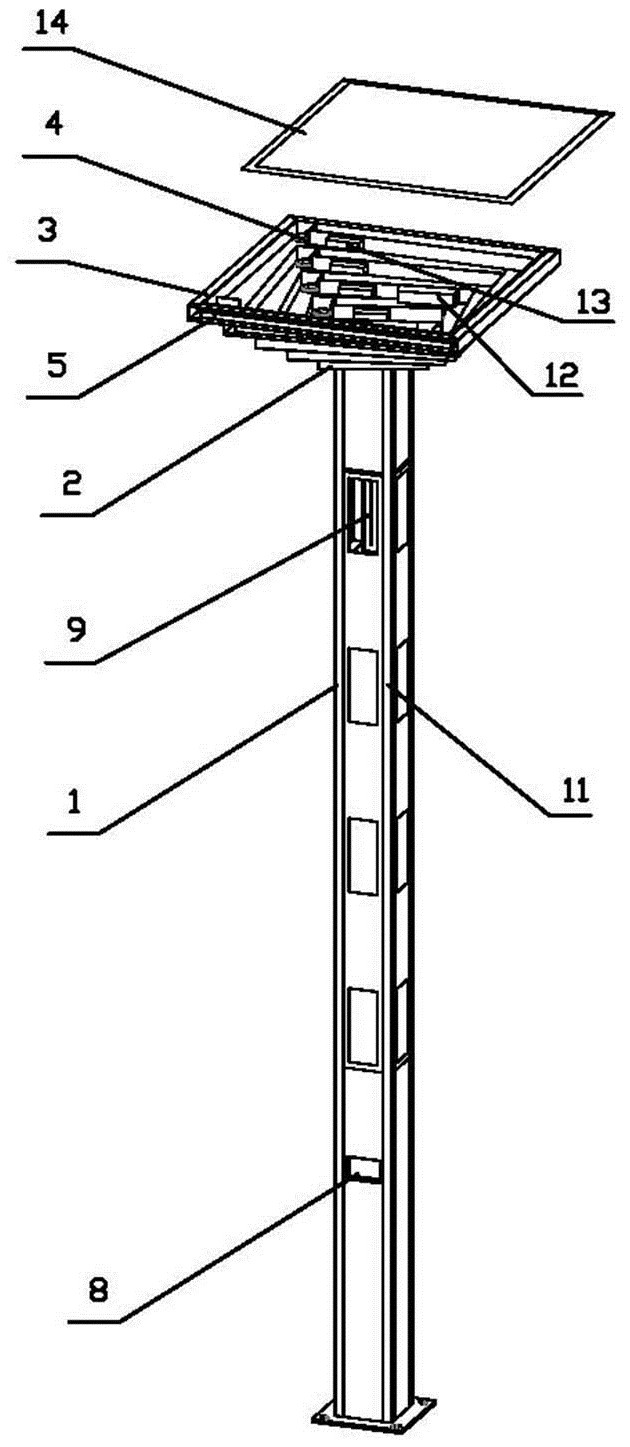 本实用新型涉及室外照明的技术领域,具体说是一种层叠式庭院灯。灯杆和固定安装在灯杆顶端的灯头,所述灯头包括壳体、固定安装在壳体内腔中的电气总成和点光源、固定安装在壳体外壁上的灯条,所述点光源的光线照射方向平行于灯杆的轴线,所述灯条的光线照射方向指向壳体的外侧并与灯杆的轴线垂直。该层叠式庭院灯结构合理、光源种类丰富、照明模式多样、照明效果好、密封效果佳,其光线照度合理、可变换多种照明模式并可以根据不同的需求改变照明模式达到按需照明、节约用电的目的。