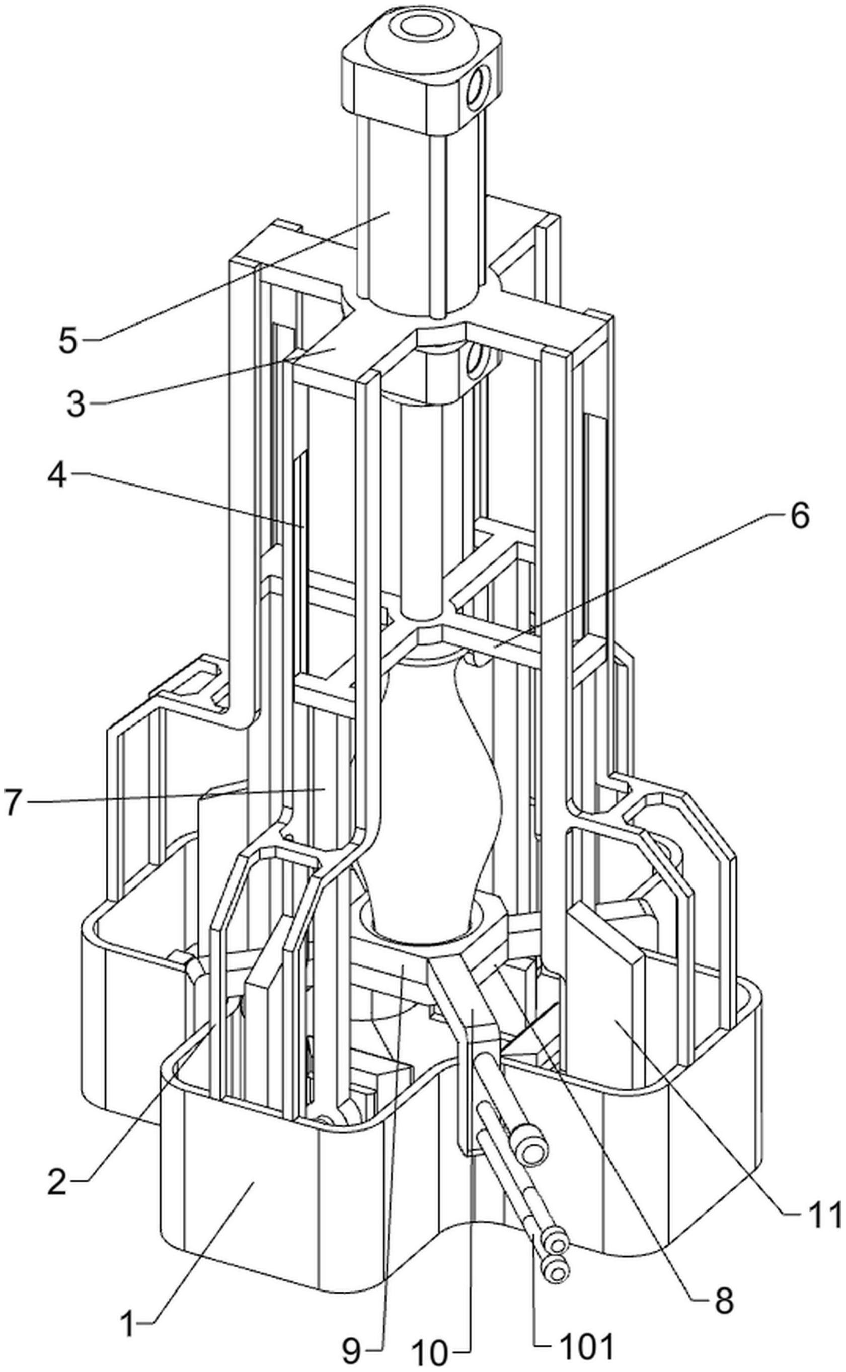 本实用新型涉及一种印刷装置,尤其涉及一种具有稳定性的玉兰花瓶用外壁印刷装置。本实用新型提供一种无需人工手持花瓶毛胚,能够固定花瓶进行印刷,工作效率高的具有稳定性的玉兰花瓶用外壁印刷装置。一种具有稳定性的玉兰花瓶用外壁印刷装置,包括储水框,用于储存颜料水,其上安装有第二固定架;连接架,其设有四个,沿周均匀间隔安装在储水框上,连接架上对称式开有两条滑槽;楔形块,安装在连接架上;第一固定架,连接在四个连接架之间。本实用新型的储水框能够储存颜料水,放置板能够放置花瓶毛胚,印刷板能够吸收颜料水,通过气缸驱动下压杆向上移动,印刷板能够向内侧移动与花瓶毛胚接触并进行印刷,提高了印刷的工作效率。