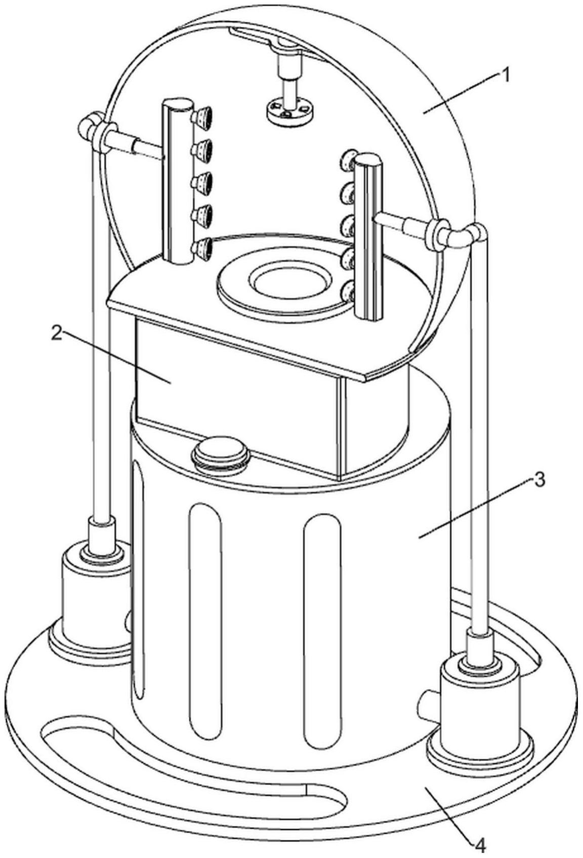 本实用新型涉及一种施釉装置,尤其涉及一种小酒斗生产用施釉装置。本实用新型要解决的技术问题是提供一种效率较高且较均匀的小酒斗生产用施釉装置。本实用新型提供了这样一种小酒斗生产用施釉装置,包括有:固定座,其上固定座上连接有储料桶;固定架,储料桶上连接有固定架;防护板,防护板连接在固定架上;固定板,固定板连接在防护板上;气缸,气缸安装在固定板上;限位塞,气缸伸缩杆上连接有限位塞;转动组件,储料桶上连接有用于搅拌釉浆并转动小酒斗的转动组件;喷洒组件,储料桶连接有用于喷洒釉浆的喷洒组件。本实用新型所述气缸、限位塞和转动组件对放置盘进行转动,使得小酒斗进行转动,从而方便人们对小酒斗均匀的施釉。