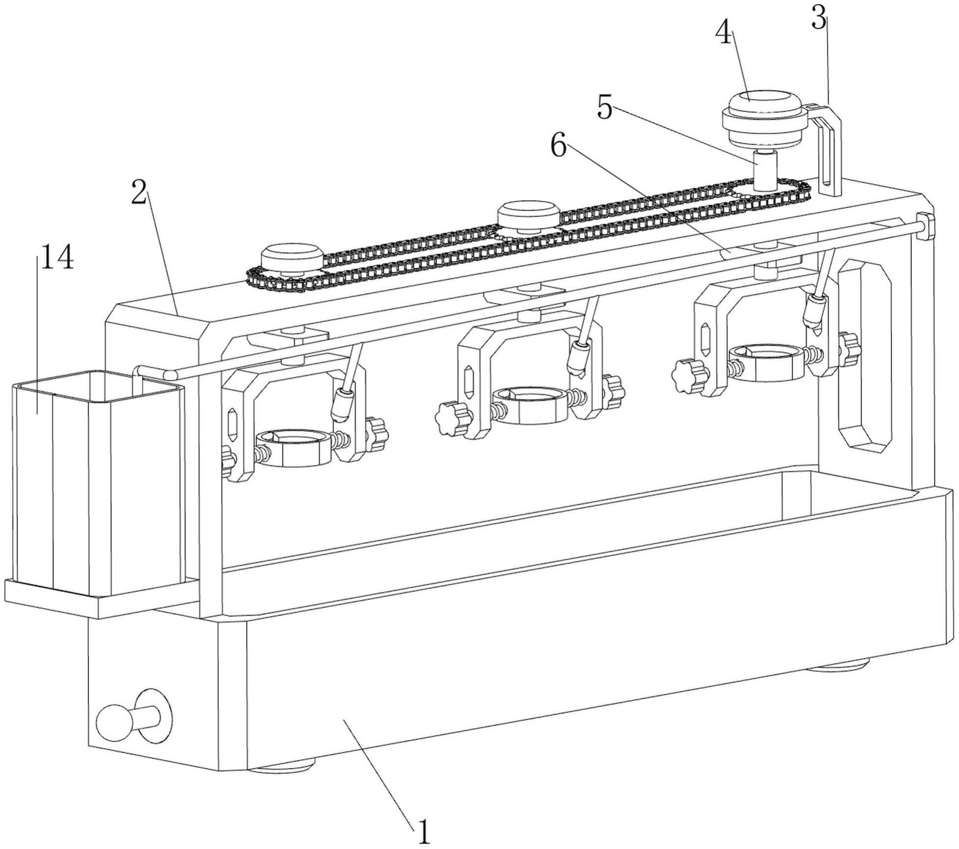 本实用新型涉及一种清洗装置,尤其涉及一种玉兰酒瓶回收用防交叉感染清洗装置。本实用新型要解决的技术问题是提供一种清洗较干净且较方便的玉兰酒瓶回收用防交叉感染清洗装置。本实用新型提供了这样一种玉兰酒瓶回收用防交叉感染清洗装置,包括有:装料框,其上连接有第一支撑板;第四支撑板,第四支撑板连接在第一支撑板上;框体,框体连接在第四支撑板上;水泵,框体上安装有水泵;水管,水管连接在水泵与第一支撑板之间;喷头,水管上连接有三个喷头;橡胶塞,橡胶塞滑动式地连接在装料框上。本实用新型所述装料框、框体、水泵、水管和喷头对玉兰酒瓶进行喷洒清洗,使得玉兰酒瓶不需放入同一个容器中进行清洗,减少细菌滋生。
