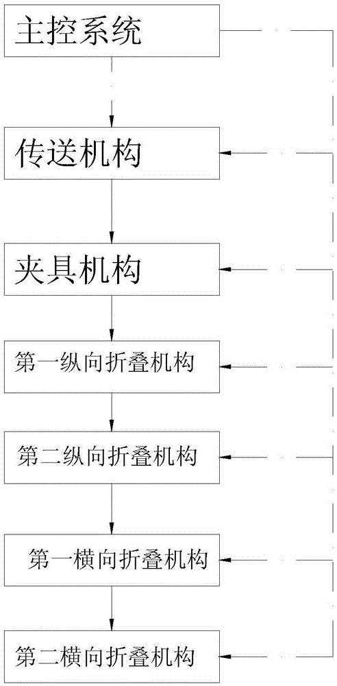 本发明公开一种双工位自动折袋系统,包括主控系统;还包括传送机构,所述传送机构包括并列放置且留有间隙的两条传送带,所述传送带的端部连接步进电机;夹具机构,所述夹具机构包括位于间隙处的推板和距离传感器,还包括位于传送带上端的第一夹具和第二夹具,第一夹具和第二夹具端部还设置滑轨;第一纵向折叠机构,包括第一置物平台,以及位于第一置物平台两侧的第一左折弯片和第一右折弯片;所述第一置物平台上端还设置有第一压片,所述第一置物平台还设置有第一传送板,所述第一传送板连接有第一驱动电机。本发明采用双工位自动折叠系统,比单工位的折叠系统效率要高,大大提高了生产效率,且质量稳定,符合客户要求。