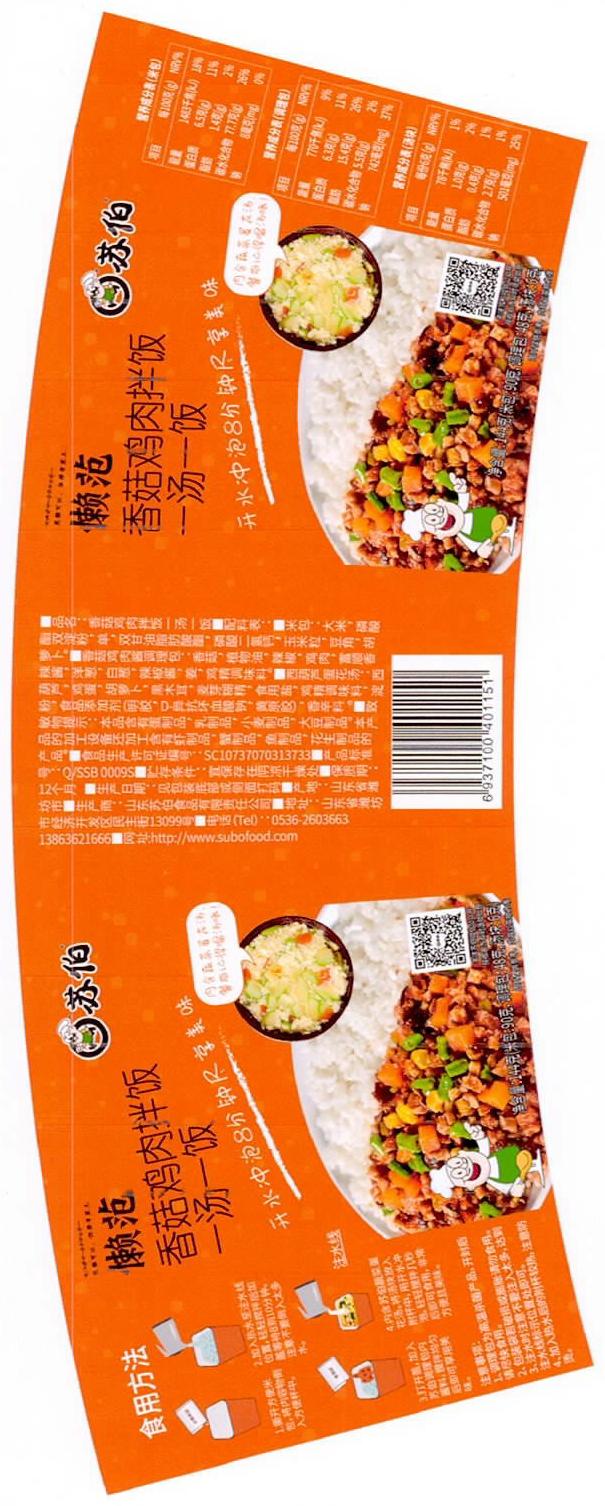 1.本外观设计产品的名称:标贴(香菇鸡肉拌饭一汤一饭)。2.本外观设计产品的用途:用于产品包装上的标贴。3.本外观设计的设计要点:产品的图案。4.最能表明设计要点的图片或者照片:主视图。5.本外观设计产品为平面产品,后视图无图案,省略后视图及其他视图。6.请求保护的外观设计产品包含有色彩。