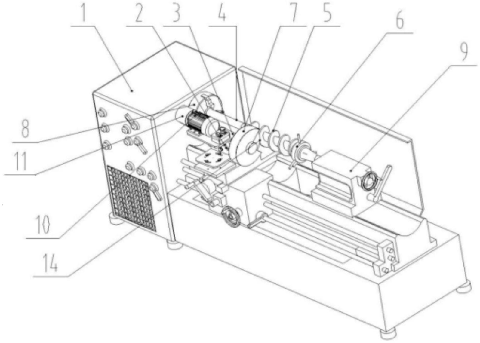 本实用新型公开了一种手工焊条用螺旋绞刀磨床,包括车床本体,所述车床本体的前侧设有溜板箱,且溜板箱上端通过螺栓固定连接有砂轮支架,所述砂轮支架的后侧中部开有连接矩形口,所述连接矩形口的内部连接有磨削头机构,所述砂轮支架的上端左侧固定连接有电机,所述砂轮支架的右端通过转轴连接有砂轮,且砂轮的转轴左端固定连接有传动盘,所述传动盘外侧通过三角带与皮带轮传动连接,所述皮带轮固定连接在电机的转轴上,所述车床本体的主轴箱右端上部连接有车床三爪卡盘,所述车床三爪卡盘固定加持有芯轴。通过设备整体结构,各部位结构与车床的有效衔接,保证整个装置的可控性,同时降低操作人员劳动负荷、提高生产效率。