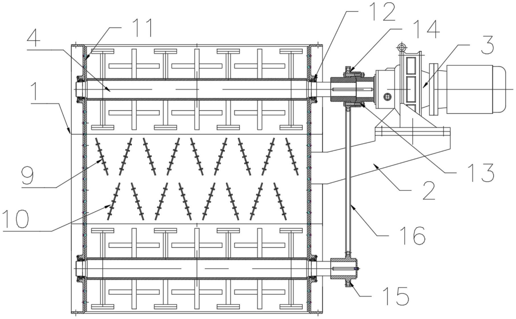 本实用新型公开了一种用于V型选粉机的物料均化布料器,涉及布料器技术领域,包括壳体,壳体内由上而下分为上部物料均化区、中部缓冲均化区、下部物料均化区,上部物料均化区与下部物料均化区内,分别设置有物料均化装置,物料均化装置包括旋转轴,旋转轴外部固定安装有多个十字均化棒与T字均化棒。借助壳体内的两组物料均化装置以及多个物料缓冲板与物料均化板的设置,将物料进行三级均化,通过三级均化后的物料,分布均匀松散,进入到V型选粉机内,物料中合格的细粉可以及时地分选出来,使V型选粉机选粉效率大大提高,同时减少了物料的循环负荷,减轻了设备的磨损消耗,延长了设备的使用寿命。